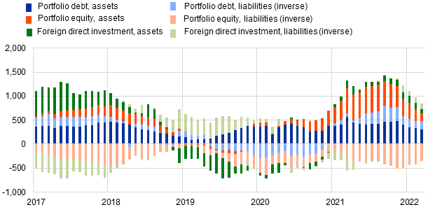 - In financial account, euro area residents’ net acquisitions of non-euro area portfolio investment securities totalled €458 billion and non-residents’ net acquisitions of euro area portfolio investment securities totalled €170 billion in 12 months to March 2022