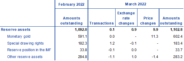 In March 2022 the Eurosystem’s stock of reserve assets increased to €1102.8 billion, up from €1092.0 billion in the previous month (Table 3). This increase was mostly driven by net positive price changes (€9.9 billion, driven by €11.3 billion due to monetary gold) and, to a lesser extent, by net positive exchange rate changes (€0.9 billion) and net acquisitions of assets (€0.1 billion).