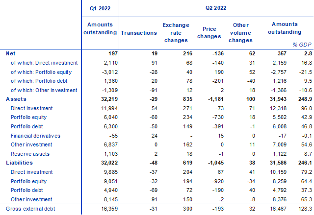 - International investment position showed net assets of €357 billion (2.8% of euro area GDP) at end of second quarter of 2022