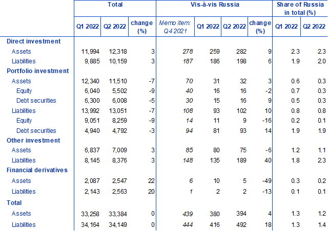 This release provides an overview of the euro area’s international investment position vis-à-vis residents of Russia at the end of the second quarter of 2022 and reports the main changes compared with the previous quarter (Table 3).[1] Euro area financial assets vis-à-vis Russia amounted to €394 billion (1.2% of euro area external assets) at the end of the second quarter of 2022, a 4% increase since the end of the previous quarter. This increase was mainly due to euro area foreign direct investment assets in Russia, which rose by 9% in the second quarter of 2022, largely on account of the appreciation of the Russian rouble. At the same time, the euro area recorded liabilities of €492 billion vis-à-vis Russia (1.4% of total external liabilities), an increase of 18%, driven mainly by larger liabilities in other investment due to the sanctions imposed by the EU on Russia, which include restrictions of payments to Russian residents and asset freezes.[2]