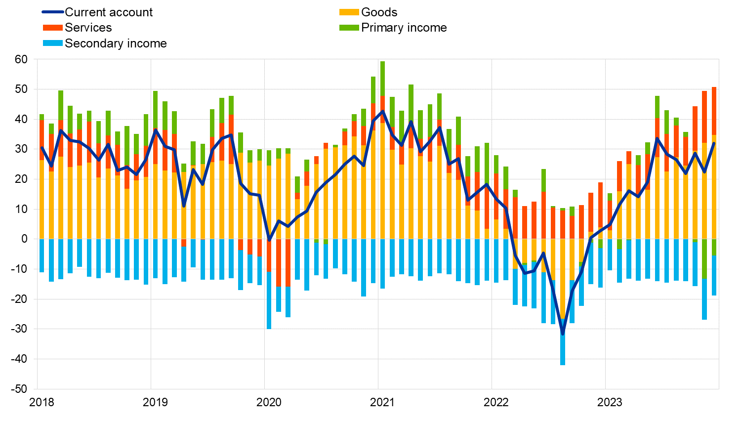 - Current account recorded €32 billion surplus in December 2023, up from €22 billion in previous month