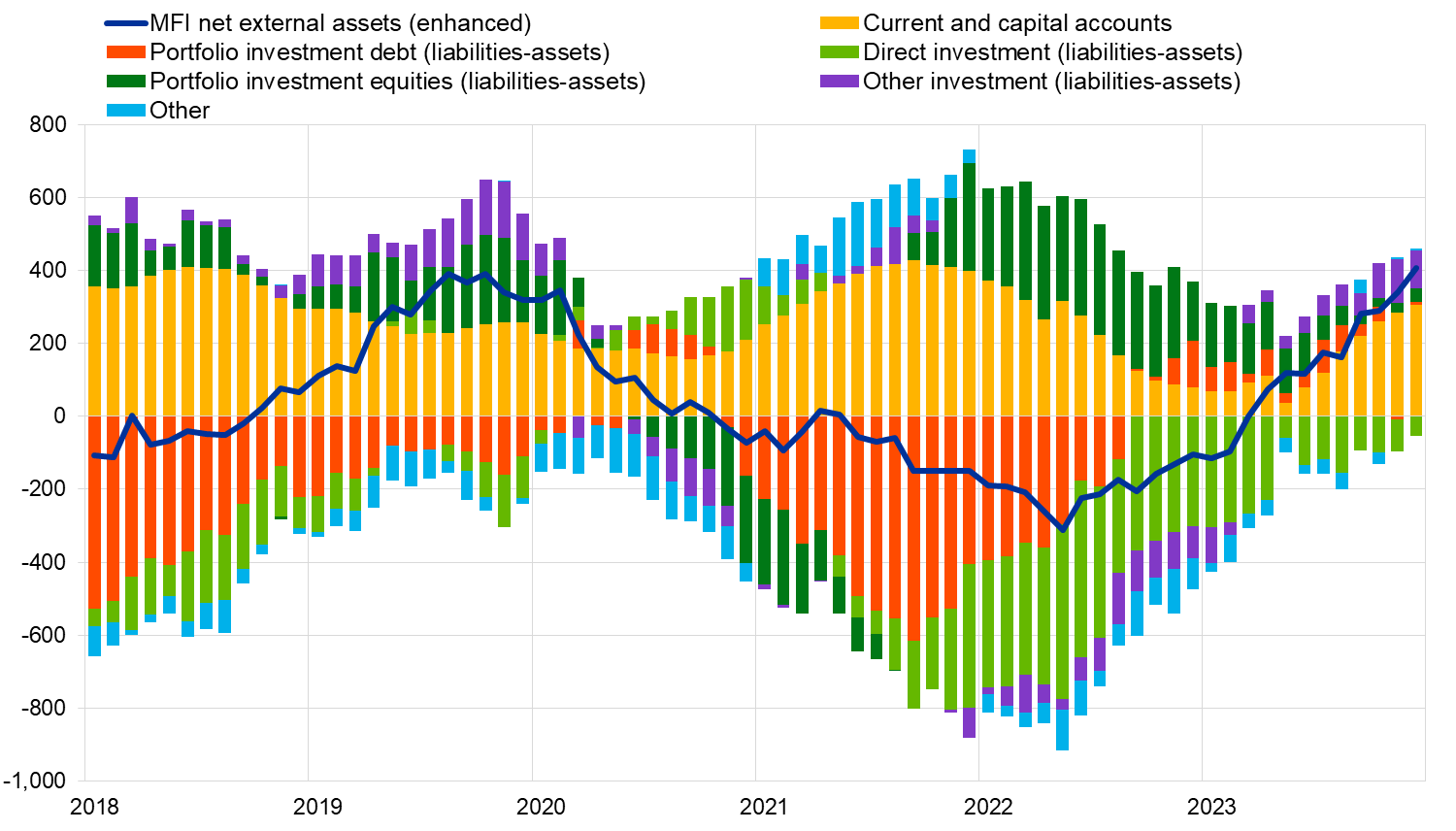 The monetary presentation of the balance of payments (Chart 3) shows that the net external assets (enhanced) of euro area MFIs rose by €406 billion in 2023. This increase was mainly driven by the current and capital accounts surplus and, to a lesser extent, by euro area non-MFIs’ net inflows in other investment and portfolio investment equity and debt. These developments were partly offset by euro area non-MFIs’ net outflows in direct investment.