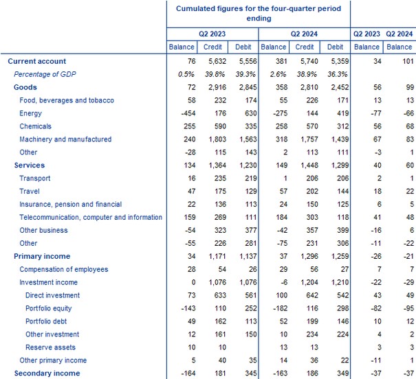 - Current account surplus at €381 billion (2.6% of euro area GDP) in four quarters to second quarter of 2024, after a €76 billion surplus (0.5% of GDP) a year earlier.