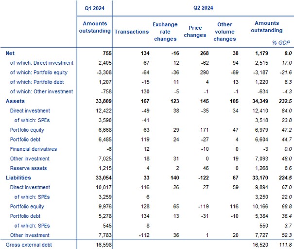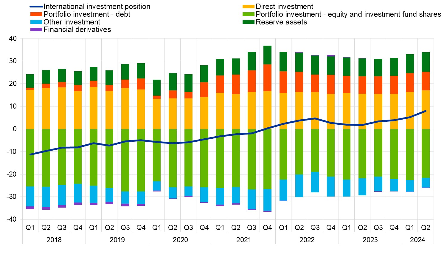 - International investment position showed net assets of €1.2 trillion (8.0% of euro area GDP) at end of second quarter of 2024.