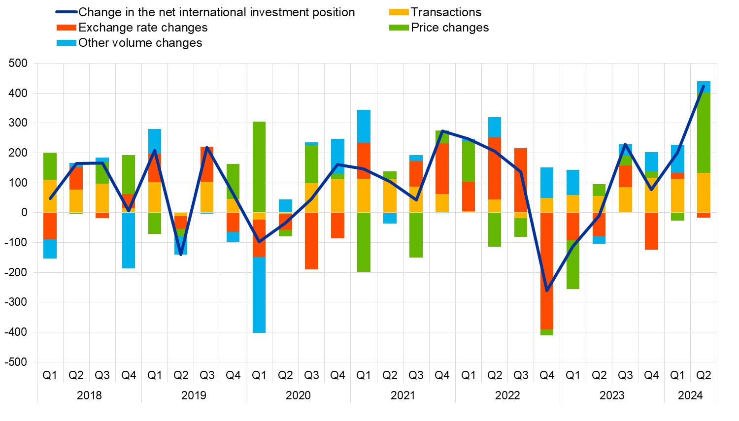 The developments in the euro area’s net international investment position in the second quarter of 2024 were driven mainly by positive price changes, transactions and other volume changes which were slightly offset by negative exchange rate changes (Table 2 and Chart 3). The large positive price changes reflect the divergent evolution of the stock exchange markets in the euro area and outside the euro area.