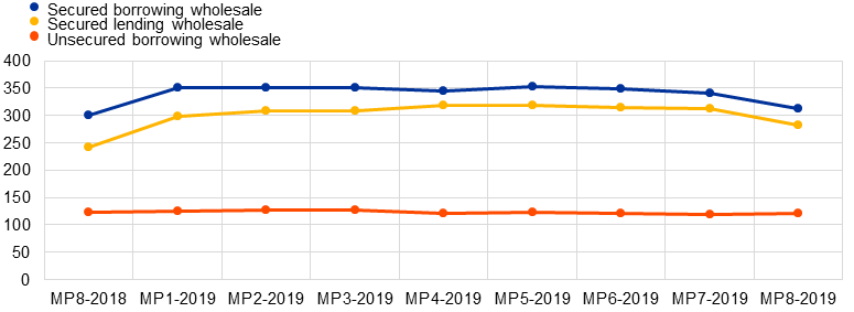 - The Eurosystem collects transaction-by-transaction information from the 50 largest euro area banks in terms of banks’ total main balance sheet assets, broken down by their borrowing from and lending to other counterparties. Unsecured transactions include all trades concluded via deposits, call accounts or short-term securities with financial corporations (except central banks where the transaction is not for investment purposes), general government as well as with non-financial corporations classified as “wholesale” under the Basel III LCR framework. Secured transactions cover all fixed-term and open-basis repurchase agreements and transactions entered into under those agreements, including tri-party repo transactions, denominated in euro with a maturity of up to one year, between the reporting agent and financial corporations (except central banks where the transaction is not for investment purposes), general government as well as non-financial corporations classified as wholesale under the Basel III liquidity coverage ratio framework. As of the first maintenance period of 2019, the wholesale sector covers all counterparties in the sectors listed above. More information on the methodology applied, including the list of reporting agents, is available in the statistics section of the ECB’s website.