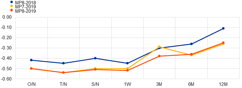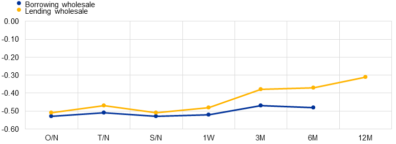 In the eighth maintenance period, the borrowing turnover in the secured segment averaged €312 billion per day, while the total borrowing turnover for the period as a whole was €8,412 billion. Cash lending represented a turnover of €7,644 billion and the daily average amounted to €283 billion. Most of the turnover was concentrated in tenors ranging from overnight to up to one week, with overnight transactions representing around 22% of the total nominal amount on the borrowing and lending side respectively. The weighted average overnight rate for borrowing and lending transactions was, respectively, -0.53% and -0.51% for the wholesale sector, compared with -0.54% and -0.51% in the previous maintenance period.
