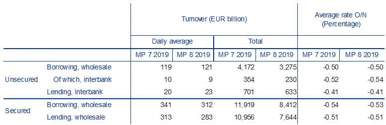 - Daily average borrowing turnover in the unsecured segment slightly increased from €119 billion in the seventh maintenance period of 2019 to €121 billion in the eighth maintenance period