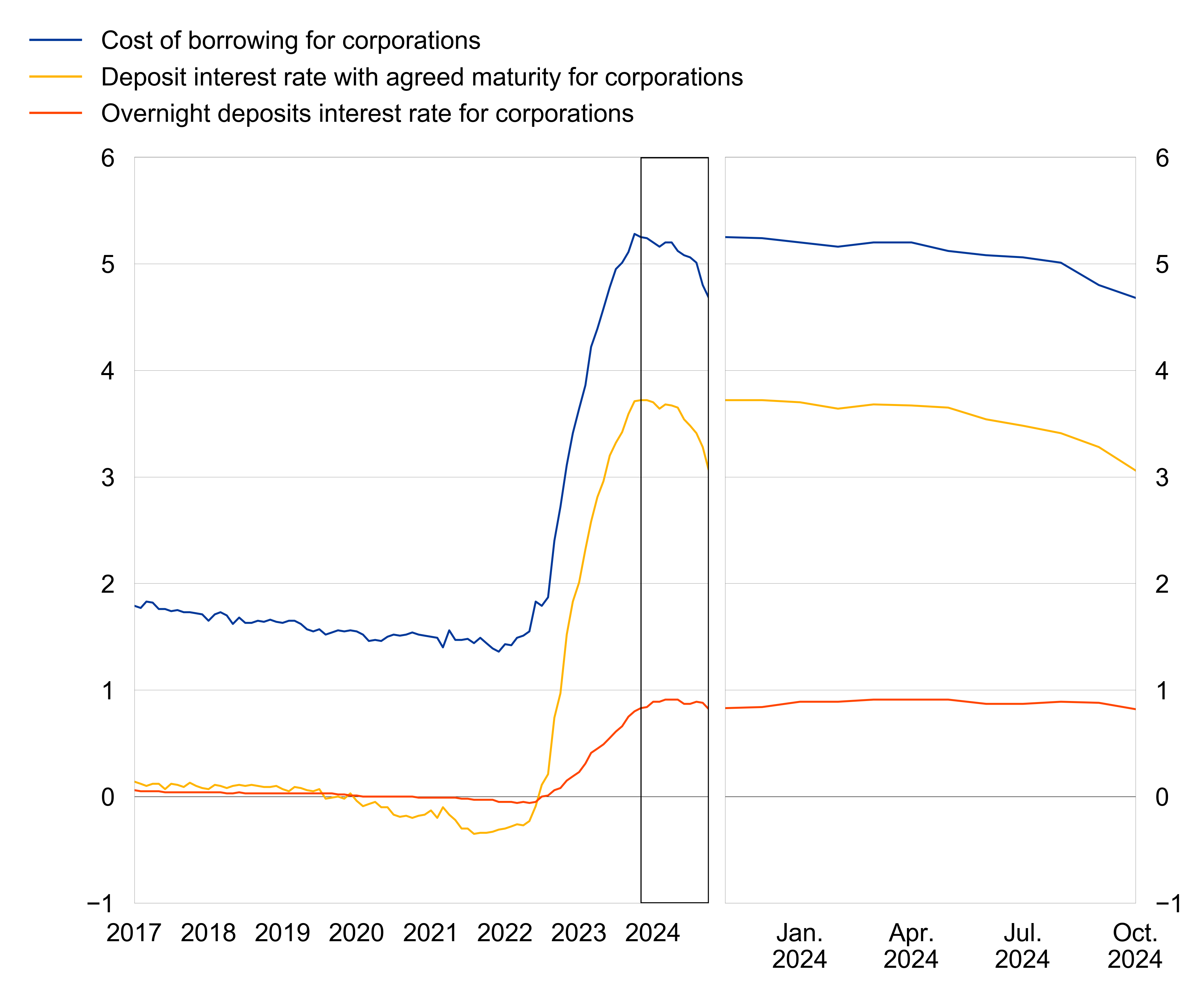 The composite cost-of-borrowing indicator, which combines interest rates on all loans to corporations, decreased in October 2024. The interest rate on new loans of over €1 million with a floating rate and an initial rate fixation period of up to three months decreased by 7 basis points to 4.65%. The rate on new loans of the same size with an initial rate fixation period of over three months and up to one year fell by 18 basis points to 4.29%. The interest rate on new loans of over €1 million with an initial rate fixation period of over ten years remained broadly unchanged at 3.60%. In the case of new loans of up to €250,000 with a floating rate and an initial rate fixation period of up to three months, the average rate charged fell by 21 basis points to 4.82%.