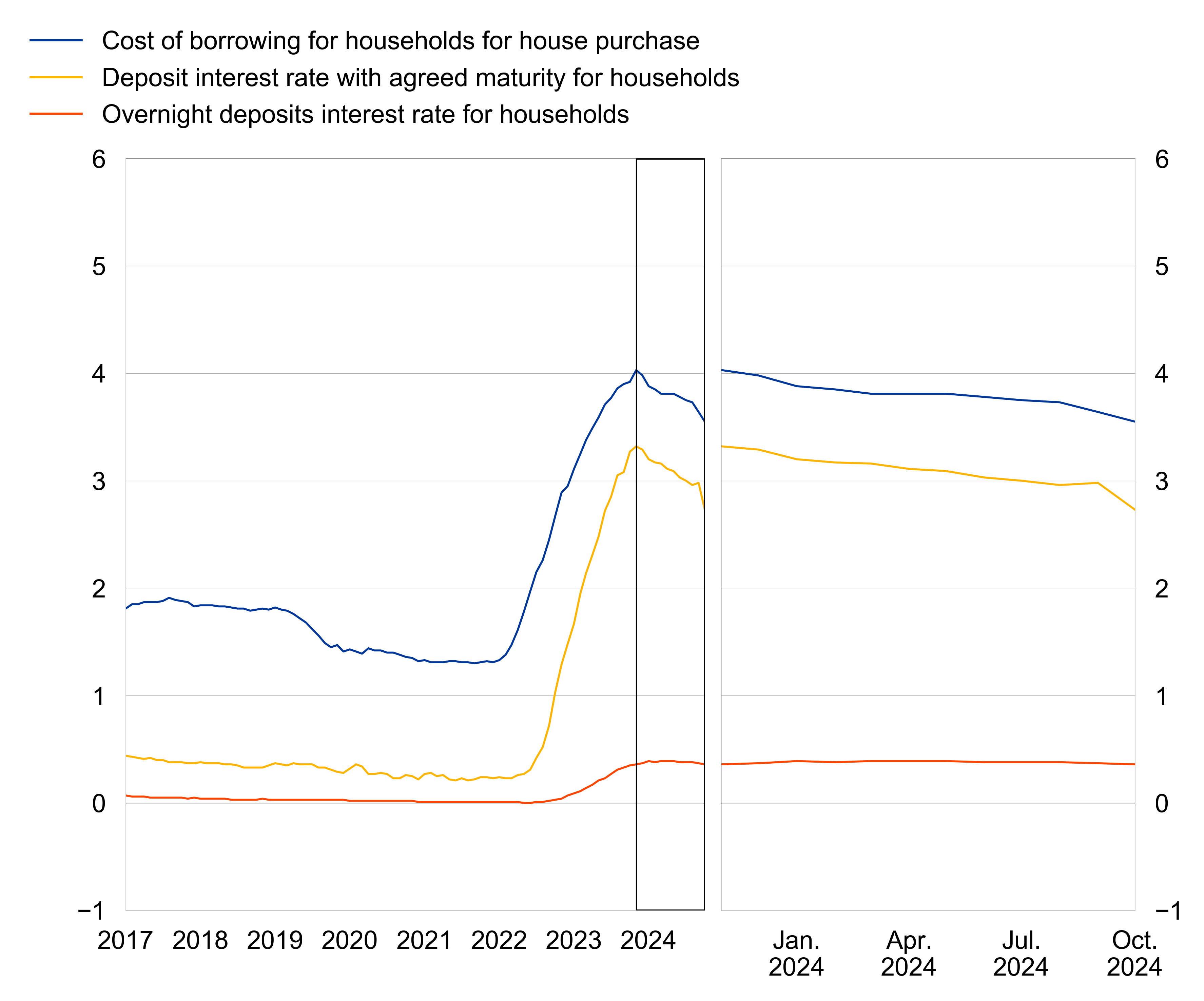 The composite cost-of-borrowing indicator, which combines interest rates on all loans to households for house purchase, decreased in October 2024. The interest rate on loans for house purchase with a floating rate and an initial rate fixation period of up to one year decreased by 22 basis points to 4.37%. The rate on housing loans with an initial rate fixation period of over one and up to five years fell by 9 basis points to 3.70%. The interest rate on loans for house purchase with an initial rate fixation period of over five and up to ten years decreased by 8 basis points to 3.47%. The rate on housing loans with an initial rate fixation period of over ten years fell by 6 basis points to 3.22%. In the same period the interest rate on new loans to households for consumption decreased by 8 basis points to 7.67%, driven by both the interest rate and the weight effects.