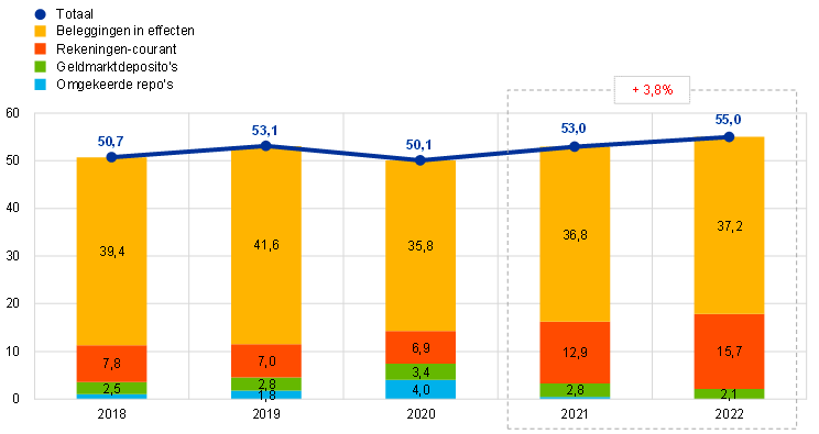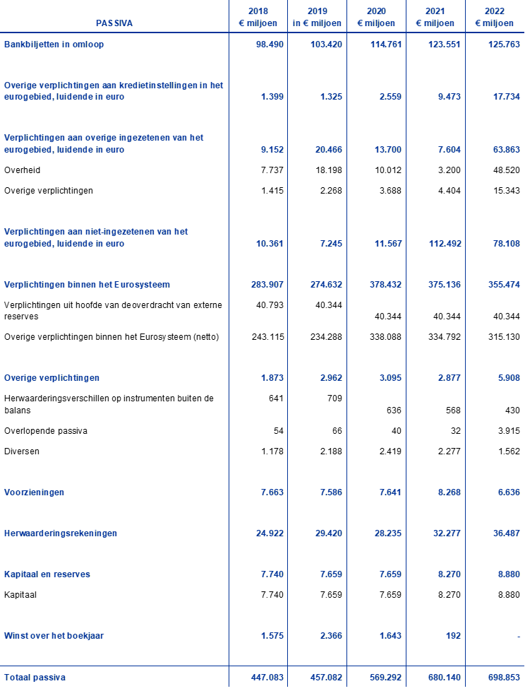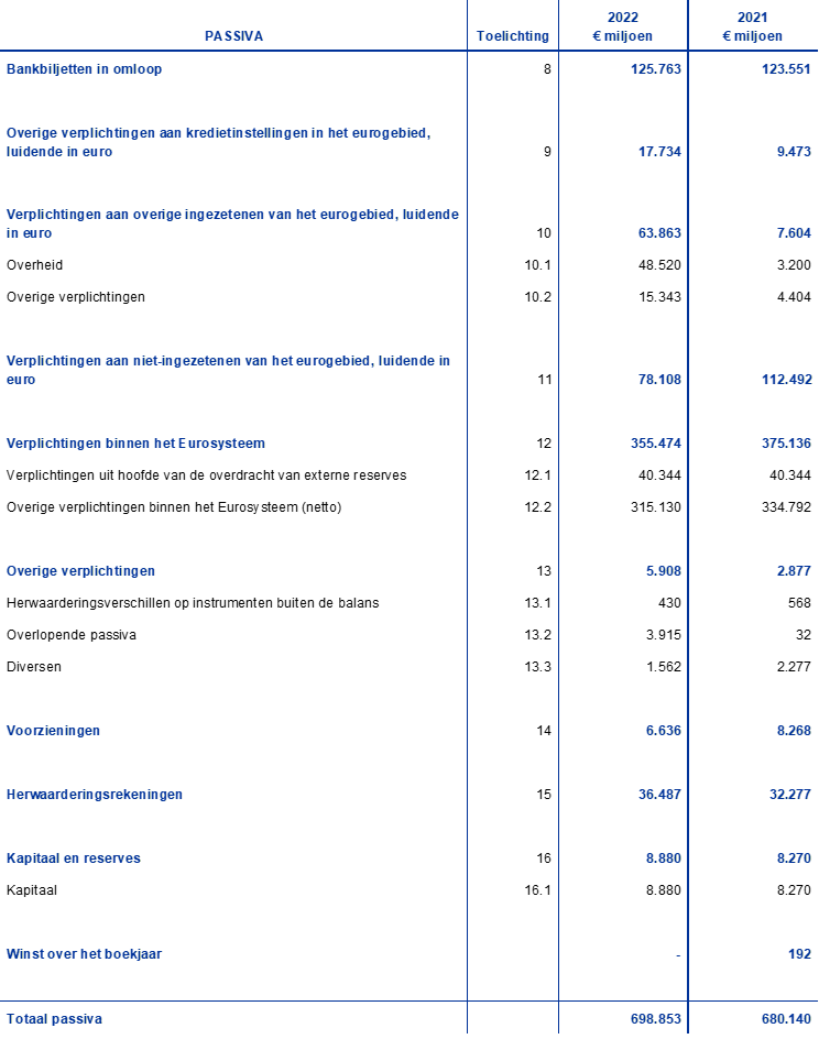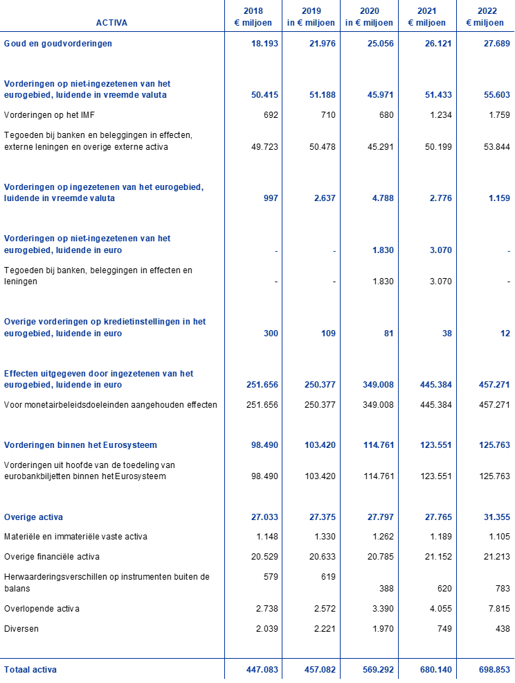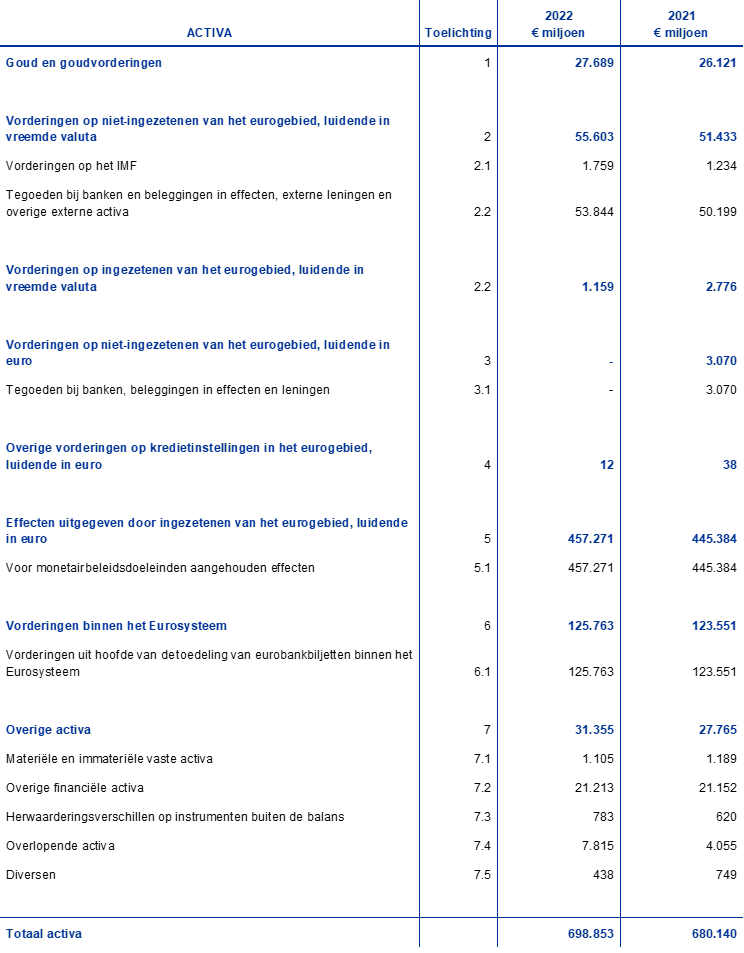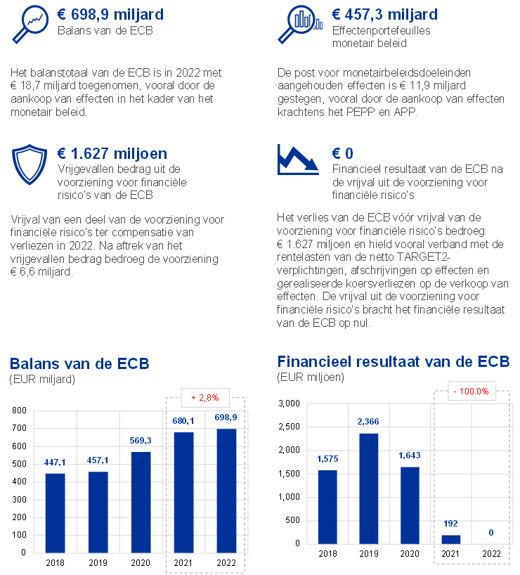 In 2022 groeide de balans van de ECB met € 18,7 miljard naar € 698,9 miljard, voornamelijk vanwege het aandeel van de ECB in de effectenaankopen krachtens het PEPP en het APP. Deze aankopen hebben geresulteerd in een toename van de ‘Voor monetairbeleidsdoeleinden aangehouden effecten’, terwijl de afwikkeling van deze aankopen in centralebankgeld via TARGET2-rekeningen tot uiting kwam in een overeenkomstige toename van de post ‘Verplichtingen binnen het Eurosysteem’. Deze toename van de vorderingen binnen het Eurosysteem werd ruimschoots gecompenseerd door de instroom van kasmiddelen als gevolg van een stijging van de door ingezetenen van het eurogebied bij de ECB geplaatste deposito’s, wat tegelijkertijd resulteerde in een toename van de overige verplichtingen.