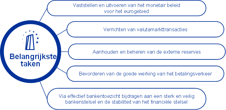 De ECB is onderdeel van het Eurosysteem, dat naast de ECB de nationale centrale banken (NCB’s) van de lidstaten van de Europese Unie (EU) omvat die de euro als munt gebruiken.[3] De hoofddoelstelling van het Eurosysteem is de handhaving van de prijsstabiliteit. De ECB vervult haar taken zoals beschreven in het Verdrag betreffende de werking van de Europese Unie[4] en in de Statuten van het Europees Stelsel van centrale banken en van de Europese Centrale Bank (Statuten van het ESCB)[5] (zie Figuur 1). De ECB voert haar werkzaamheden uit ter vervulling van haar mandaat, zonder winstoogmerk.