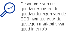 Als gevolg van een stijging van de marktprijs van goud (uitgedrukt in euro’s) is de eurowaarde van de goudvoorraad (bestaande uit goud en goudvorderingen) van de ECB in 2022 met € 1,6 miljard toegenomen naar € 27,7 miljard (Grafiek 4), bij een gelijkblijvend volume (in ‘fine ounces’). Door deze stijging namen de herwaarderingsrekeningen voor de goudvoorraad van de ECB met hetzelfde bedrag toe (zie Paragraaf 1.3.2 ‘Financieringsmiddelen’).