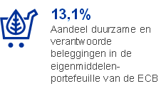 Het aandeel groene beleggingen in de eigenmiddelenportefeuille bleef toenemen, van 7,6% aan het einde van 2021 tot 13,1% eind 2022. De ECB is van plan dit aandeel de komende jaren verder te vergroten.[11] Sinds 2021 worden aankopen van groene effecten op de secundaire markten aangevuld met beleggingen in het beleggingsfonds van in euro’s luidende groene obligaties voor centrale banken, waarmee de Bank voor Internationale Betalingen in januari 2021 is gestart.