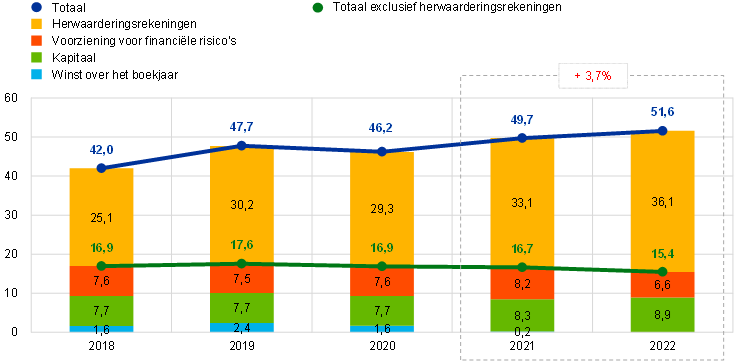 De financieringsmiddelen van de ECB bestaan uit het kapitaal, de voorziening voor financiële risico's en het algemeen reservefonds, de herwaarderingsrekeningen en de eventuele jaarwinst. Deze financieringsmiddelen worden i) belegd in activa die inkomsten genereren, en/of ii) gebruikt om verliezen te compenseren. Per 31 december 2022 bedroegen de financieringsmiddelen van de ECB in totaal € 51,6 miljard (Grafiek 11). Dat was € 1,8 miljard meer dan in 2021 als gevolg van de stijging van: (i) het saldo van de herwaarderingsrekeningen onder invloed van de appreciatie van de Amerikaanse dollar ten opzichte van de euro en de stijging van de marktprijs van goud (uitgedrukt in euro's) in 2022; (ii) het gestorte kapitaal. Deze stijgingen werden gedeeltelijk gecompenseerd, voornamelijk door afname van de voorziening voor financiële risico’s, die deels werd aangewend om de verliezen over 2022 te compenseren.