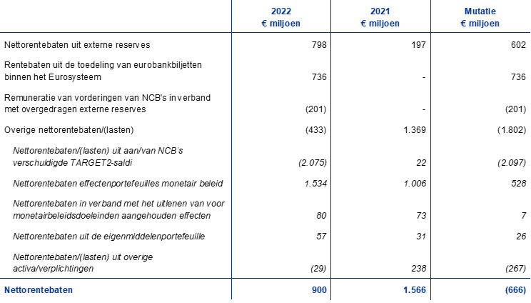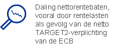 De nettorentebaten van de ECB zijn met € 666 miljoen gedaald naar € 900 miljoen (Grafiek 14), voornamelijk als gevolg van de rentelasten op het saldo van de TARGET2-verplichtingen. De rentelasten in verband met de vergoedingen aan de nationale centrale banken van het eurogebied voor hun vorderingen op de ECB vanwege aan de ECB overgedragen externe reserves droegen eveneens aan deze daling bij. Deze lasten werden deels gecompenseerd door hogere rentebaten uit: (i) de vorderingen van de ECB uit hoofde van de toedeling van eurobankbiljetten binnen het Eurosysteem; (ii) de externe reserves; en (iii) de voor monetairbeleidsdoeleinden aangehouden effecten.