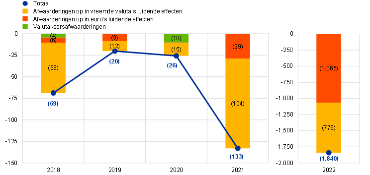 Positieve ongerealiseerde resultaten op goud en vreemde valuta’s en op aan prijsherwaardering onderhevige effecten worden niet als baten in de winst-en-verliesrekening opgenomen, maar rechtstreeks verwerkt op de herwaarderingsrekeningen aan de passivazijde van de balans van de ECB. De saldi van de herwaarderingsrekeningen kunnen worden gebruikt om eventuele toekomstige ongunstige bewegingen in de respectieve prijzen en/of wisselkoersen te absorberen, en versterken derhalve de weerbaarheid van de ECB ten opzichte van de onderliggende risico’s. In 2022 is het saldo van de herwaarderingsrekeningen voor goud, vreemde valuta’s en effecten[14] met € 3,0 miljard gestegen naar € 36,1 miljard, als gevolg van hogere herwaarderingssaldi voor vreemde valuta's en goud in verband met de waardestijging van de Amerikaanse dollar ten opzichte van de euro (Grafiek 12) en de stijging van de marktprijs van goud uitgedrukt in euro's. Deze stijgingen werden ten dele gecompenseerd door de daling van de herwaarderingssaldi voor effecten.