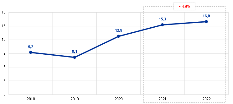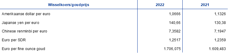 In 2022 steeg de waarde in euro’s van de externe reserves van de ECB, bestaande uit de goudvoorraad, bijzondere trekkingsrechten, Amerikaanse dollars (USD), Japanse yen (JPY) en Chinese renminbi (CNY), met € 4,1 miljard naar € 84,5 miljard.