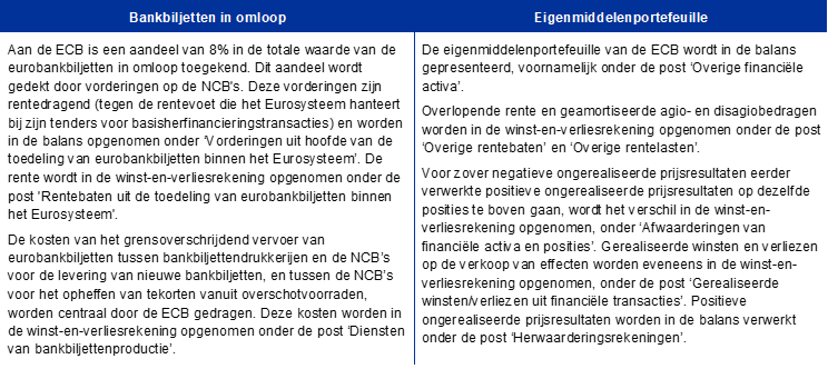 Binnen het Eurosysteem wordt het monetair beleid in beginsel decentraal ten uitvoer gelegd. Dit impliceert dat de monetairbeleidstransacties van het Eurosysteem in de jaarrekening van de ECB en die van de NCB’s van het eurogebied worden verantwoord. Tabel 1 bevat een overzicht van de belangrijkste transacties en functies van de ECB die voortvloeien uit haar mandaat, en de invloed daarvan op de jaarrekening van de ECB.