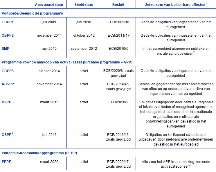 Het APP bestaat uit het derde aankoopprogramma voor gedekte obligaties (covered bond purchase programme – CBPP3), het aankoopprogramma voor effecten op onderpand van activa (asset-backed securities purchase programme – ABSPP), het aankoopprogramma voor door de publieke sector uitgegeven schuldbewijzen (public sector purchase programme – PSPP) en het aankoopprogramma voor door de bedrijvensector uitgegeven schuldbewijzen (corporate sector purchase programme – CSPP). De ECB verricht geen effectenaankopen in het kader van het CSPP. Nadere informatie over het APP is beschikbaar op de website van de ECB.