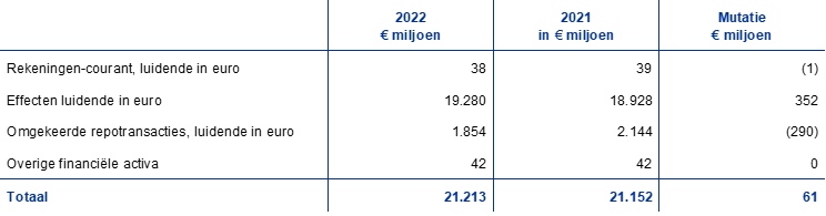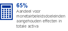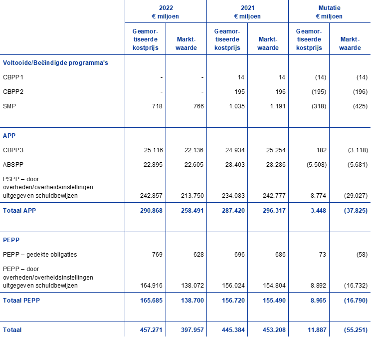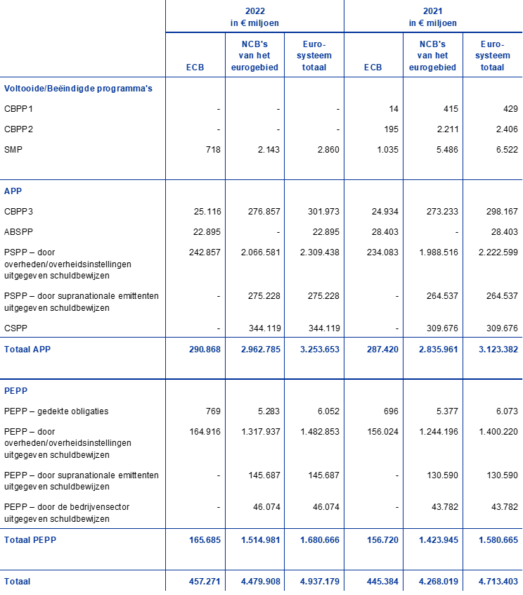 Eind 2022 bestonden de totale activa van de ECB voor 65% uit voor monetairbeleidsdoeleinden aangehouden effecten luidende in euro. Deze balanspost betreft de effecten die de ECB heeft aangekocht in het kader van het programma voor de effectenmarkten (securities markets programme – SMP), het derde aankoopprogramma’s voor gedekte obligaties (third covered bond purchase programme – CBPP3), het programma voor de aankoop van effecten op onderpand van activa (asset-backed securities purchase programme – ABSPP), het aankoopprogramma voor door de publieke sector uitgegeven schuldbewijzen (public sector purchase programme – PSPP) en het pandemie-noodaankoopprogramma (pandemic emergency purchase programme – PEPP). Alle effecten die nog werden aangehouden in het kader van het eerste en tweede programma voor de aankoop van gedekte obligaties (CBPP1 en CBPP2) bereikten in 2022 het einde van hun looptijd.