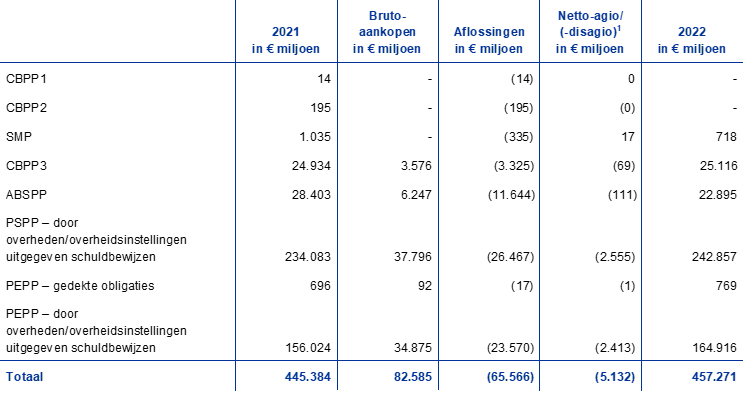 Op basis van de desbetreffende besluiten van de Raad van Bestuur heeft de ECB haar nettoaankopen van effecten in het kader van het PEPP voortgezet tot eind maart 2022, terwijl de nettoaankopen in het kader van het APP per 1 juli 2022 werden beëindigd. Voor beide portefeuilles geldt dat de aflossingen op afgelopen effecten ook in 2022 volledig werden geherinvesteerd. Als gevolg van deze aankopen en herinvesteringen is de waarde van de door de ECB voor monetairbeleidsdoeleinden aangehouden effectenportefeuille met € 11,9 miljard gestegen, naar € 457,3 miljard (Grafiek 2). De PEPP- en PSPP-portefeuilles namen met respectievelijk € 9,0 miljard en € 8,8 miljard in waarde toe. Dat de ABSPP-portefeuille met € 5,5 miljard in waarde daalde was het gevolg van aflossingen.