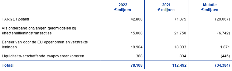Indien er aan het einde van het jaar wel sprake is van onderpand in de vorm van onbelegde geldmiddelen, dan worden deze transacties op balansrekeningen geregistreerd (zie toelichting 9 ‘Overige verplichtingen aan kredietinstellingen in het eurogebied, luidende in euro’ en toelichting 11 ‘Verplichtingen aan niet-ingezetenen van het eurogebied, luidende in euro’).