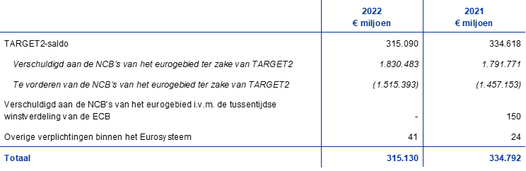 De verplichtingen van de ECB binnen het Eurosysteem zijn met € 19,7 miljard gedaald naar € 355,5 miljard ultimo 2022. Deze verplichtingen bestaan voornamelijk uit het saldo van de TARGET2-vorderingen en -verplichtingen van de NCB’s van het eurogebied ten opzichte van de ECB en de verplichtingen van de ECB met betrekking tot de externe reserves die de NCB's aan de ECB hebben overgedragen toen ze tot het Eurosysteem toetraden.