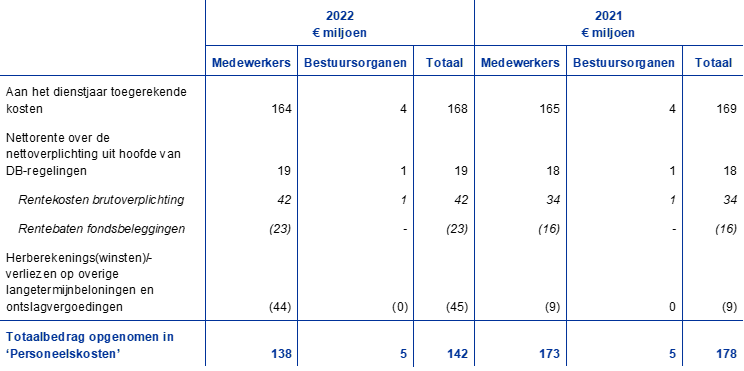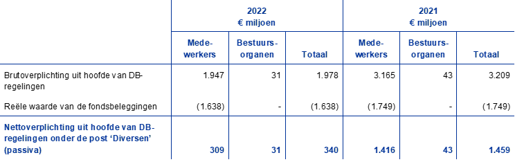 Het DB-gedeelte van de regeling weerspiegelt enkel de verplichte bijdragen van de ECB en het personeel. De vrijwillige bijdragen van personeelsleden aan de toegezegdebijdragenzuil in 2022 bedroegen € 189 miljoen (2021: € 220 miljoen). Deze bijdragen worden belegd in de fondsbeleggingen en leiden tevens tot een hiermee corresponderende verplichting.