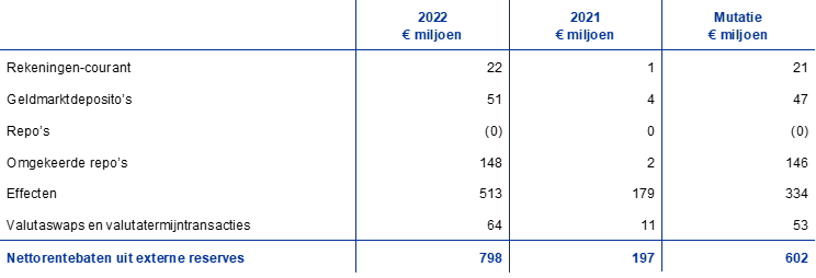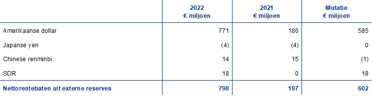 De nettorentebaten uit de externe reserves stegen met € 602 miljoen tot € 798 miljoen, overwegend ten gevolge van hogere rentebaten uit in Amerikaanse dollars luidende effecten. De gemiddelde rentebaten op de Amerikaanse dollarportefeuille van de ECB zijn in 2022 gestegen ten opzichte van het voorgaande jaar als gevolg van (i) verkopen en aflossingen van in het verleden aangekochte obligaties met een lager rendement; en (ii) aankopen van effecten met een hoger rendement als gevolg van de stijgende rendementsontwikkeling van in Amerikaanse dollar luidende obligaties sinds eind 2021 (Grafiek 17).