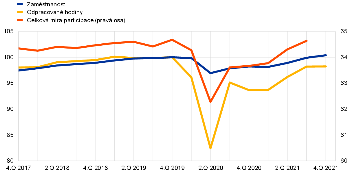 Poznámka: Poslední údaje jsou za čtvrté čtvrtletí roku 2021 pro zaměstnanost a počet odpracovaných hodin a za třetí čtvrtletí roku 2021 pro míru participace pracovní síly.