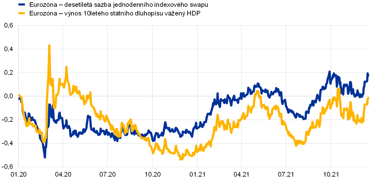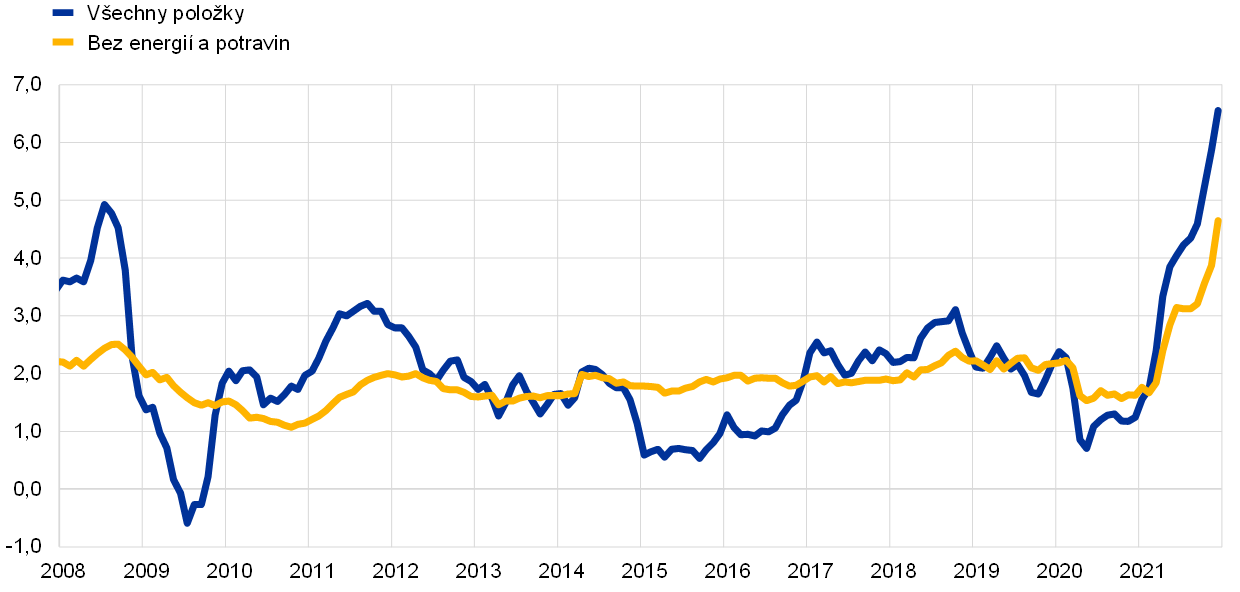 V roce 2021 došlo k výraznému oživení světové ekonomiky, a to především v důsledku opětovného otevírání ekonomik, rostoucí míry proočkovanosti proti onemocnění COVID-19 a silné a včasné podpory ze strany měnové a fiskální politiky. Toto oživení však bylo ve vyspělých i rozvíjejících se tržních ekonomikách poněkud nerovnoměrné. Globální inflace se zvýšila, což odráželo především prudký nárůst cen energií a převis poptávky nad nabídkou v některých odvětvích, jenž byl důsledkem problémů souvisejících s pandemií i dalších překážek na straně nabídky a v dopravě. Růst reálného HDP v eurozóně vykázal v roce 2021 výrazné oživení, zatímco v roce předchozím zaznamenal největší pokles v historii. Toto oživení, které vedlo ke zlepšení situace na trzích práce, bylo podpořeno včasnými a rozhodnými opatřeními měnové a fiskální politiky. Ekonomická nejistota nicméně během roku přetrvala na zvýšené úrovni s tím, že situace ve dvou největších odvětvích – průmyslu a službách – se výrazně lišila. Na počátku roku byl růst ovlivněn uzavírkami a omezeným cestováním, což mělo nepříznivý dopad na nabídku i poptávku po službách. V důsledku výjimečně silného oživení světové poptávky, problémů v zásobování a vyšších nákladů na energie také později došlo k omezení výroby v průmyslu. Inflace v eurozóně, měřená harmonizovaným indexem spotřebitelských cen (HICP), prudce vzrostla z 0,3 % v roce 2020 na 2,6 % v roce 2021. V prvních měsících roku se držela na nízkých úrovních, v jeho průběhu však zrychlila a v prosinci dosáhla 5,0 %. Růst cen do značné míry odrážel prudký a plošný nárůst cen energií, nerovnováhu mezi poptávkou a nabídkou po znovuotevření ekonomik i techničtější faktory, jako byl například opětovný nárůst DPH v Německu po jejím dočasném snížení. Pro nejbližší období po roce 2021 se očekávalo, že inflace na vyšších úrovních ještě setrvá, avšak během roku 2022 by již měla klesat. Invaze Ruska na Ukrajinu však výrazně zvýšila nejistotu v souvislosti s výhledem inflace.