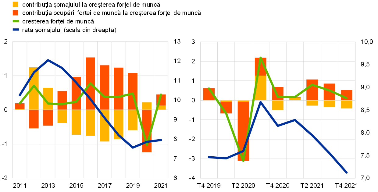Ratele ridicate ale locurilor de muncă vacante, inițial înregistrate cu predilecție în sectoarele redeschise după ridicarea măsurilor de izolare, au caracterizat apoi și alte sectoare, pe măsura progreselor privind redresarea activității. Ritmul de creștere a gradului de ocupare a forței de muncă s-a consolidat în trimestrele II și III 2021 și, în pofida unor influențe nefavorabile ca urmare a blocajelor pe partea ofertei din industria prelucrătoare, s-a menținut robust și generalizat în trimestrul IV. Acest lucru a determinat apropierea gradului de ocupare a forței de muncă de nivelurile prepandemice în industrie, construcții și sectoarele serviciilor care presupun o interacțiune fizică mai redusă. Ocuparea forței de muncă în sectoarele care presupun un grad ridicat de contact fizic s-a menținut relativ scăzută în comparație cu nivelurile anterioare pandemiei.