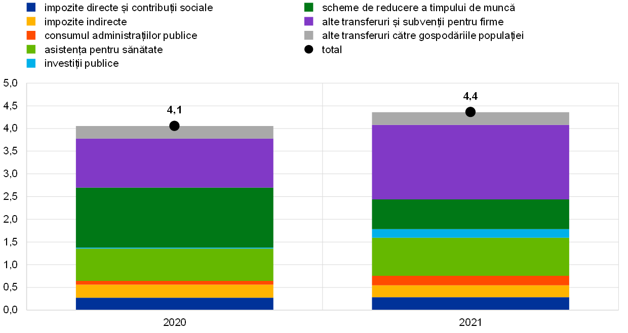 Ponderea în PIB a măsurilor pentru combaterea efectelor crizei și a celor de stimulare a redresării economice în zona euro s-a majorat la 4,4% în anul 2021 de la 4,1% în anul precedent (Graficul 1.11). Această creștere s-a datorat unui volum mult mai amplu de transferuri publice către companii, dar și intensificării asistenței pentru sănătate, precum și investițiilor publice. Totuși, aceste majorări au fost compensate, în mare măsură, de recursul în scădere la schemele de reducere a timpului de muncă. Deși astfel de scheme au reprezentat cel mai important instrument de sprijin din partea autorităților în anul 2020, acestea s-au restrâns treptat în 2021, pe fondul relaxării măsurilor restrictive și al începerii procesului de redresare a piețelor forței de muncă, odată cu revirimentul generalizat al activității economice. Îmbunătățirea producției explică, de asemenea, motivul pentru care ponderea datoriei publice în PIB în zona euro a scăzut marginal la 97% în 2021, după o creștere semnificativă în anul precedent.