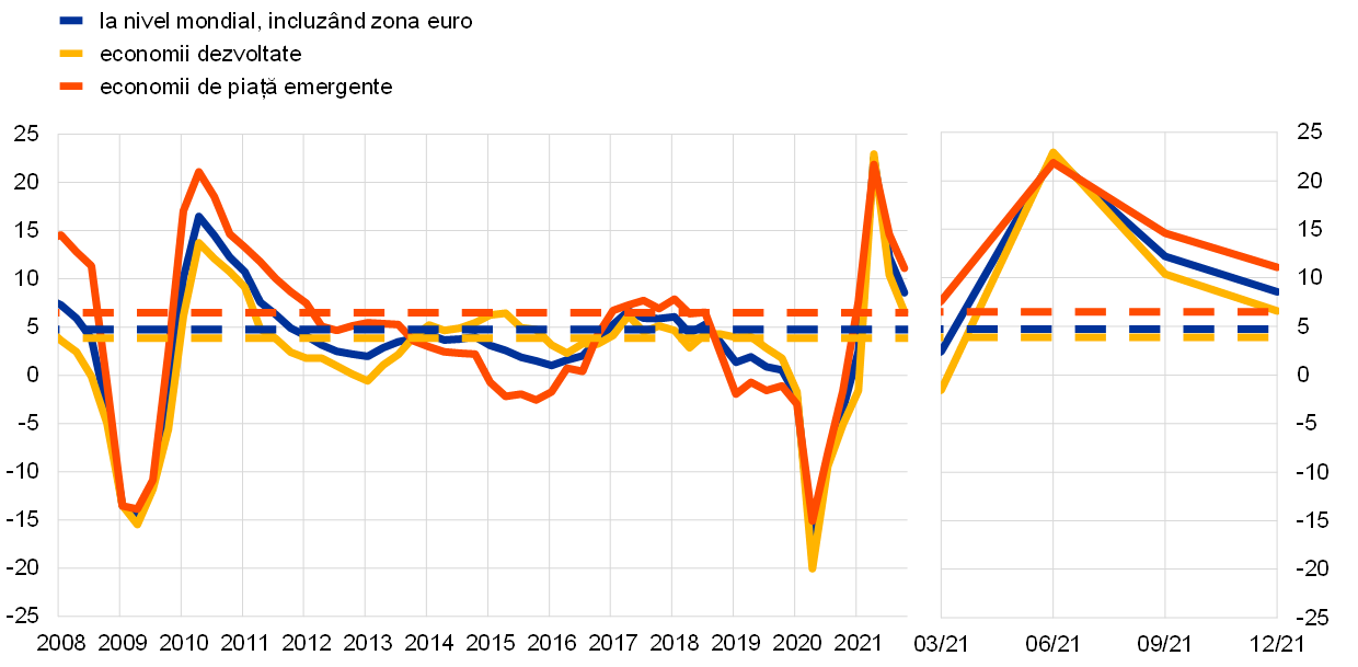 Notă: Datele agregate sunt calculate folosind PIB ajustat cu ponderile pe baza parității puterii de cumpărare. Liniile continue indică datele până în trimestrul IV 2021. Liniile întrerupte indică mediile pe termen lung (între trimestrul I 1999 și trimestrul IV 2021). Cele mai recente date se referă la decembrie 2021 și au fost actualizate pe 28 februarie 2022.