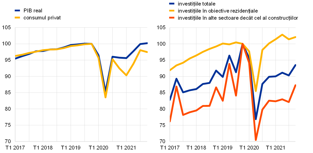 Notă: Cele mai recente date se referă la trimestrul IV 2021. În trimestrul IV 2021, investițiile totale și investițiile în alte sectoare decât cel al construcțiilor s-au situat cu 6,5% și 12,7% sub nivelurile de dinaintea pandemiei (trimestrul IV 2019). Cu toate acestea, excluzând datele pentru Irlanda, cifrele înregistrate la finele anului 2021 au fost cu 1,1% și 0,5% peste nivelurile de dinaintea pandemiei. Aceste diferențe mari pot fi atribuite marilor companii multinaționale care utilizează Irlanda ca bază de operațiuni, ceea ce duce la fluctuații semnificative ale investițiilor în produse de proprietate intelectuală.