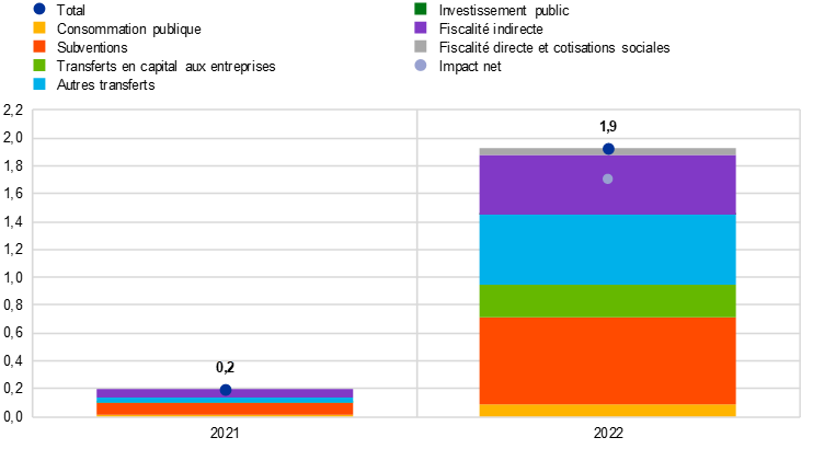 Notes : Les chiffres positifs indiquent un soutien budgétaire. Les barres et les totaux représentent le soutien budgétaire brut. L’impact net montre le soutien brut moins les mesures de financement discrétionnaires pour le besoin indiqué, telles qu’identifiées par les services de l’Eurosystème.