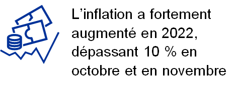 L’inflation dans la zone euro a augmenté pour s’établir à 8,4 % en 2022, après 2,6 % en 2021, reflétant principalement une forte hausse des prix de l’énergie et des produits alimentaires provoquée par la guerre en Ukraine. Les goulets d’étranglement antérieurs au niveau de l’offre et la demande latente résultant de la pandémie de coronavirus (COVID-19), associés aux coûts élevés des consommations intermédiaires dans la production dus à la hausse des prix de l’énergie, ont accru les tensions sur les prix dans de nombreux secteurs de l’économie. Après un premier semestre 2022 soutenu, quand le secteur des services en particulier bénéficiait de la levée des restrictions liées à la pandémie, la croissance s’est ralentie dans la zone euro, en raison principalement des effets liés à la guerre en Ukraine.
