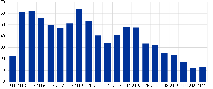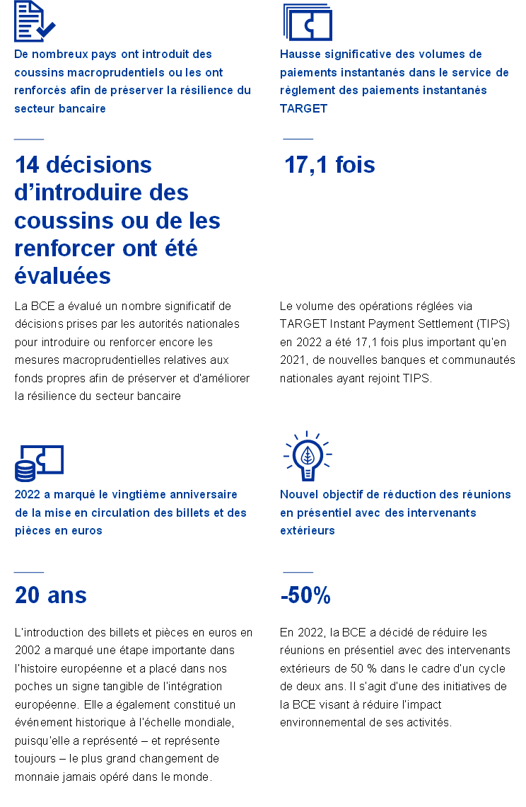 L’année sous revue a également été marquée par le vingtième anniversaire de l’introduction des billets et des pièces en euros, une étape importante de l’histoire européenne et un symbole tangible de l’intégration européenne. À ce jour, les espèces restent le mode de règlement le plus fréquemment utilisé par les Européens, représentant près de 60 % des paiements, et la monnaie fiduciaire continuera, à n’en pas douter, à jouer un rôle majeur dans la vie de chacun. Pour autant, au vu de la numérisation croissante de l’économie, nous devons veiller à ce que les Européens aient également accès à des moyens de paiement numériques sûrs, efficaces et pratiques. C’est pourquoi l’Eurosystème étudie la possibilité d’émettre un euro numérique. Dans le cadre de la phase d’étude en cours, l’Eurosystème a approuvé en 2022 les principaux cas d’utilisation et adopté plusieurs décisions essentielles relatives à sa conception.