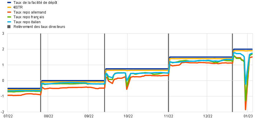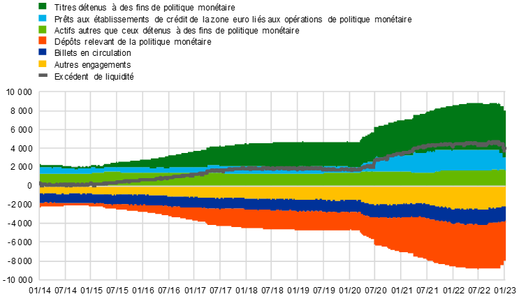 En décembre, à l’issue de notre dernière réunion de politique monétaire de l’année, nous avons par conséquent annoncé que les taux d’intérêt devraient encore être augmentés sensiblement à un rythme régulier, afin d’atteindre des niveaux suffisamment restrictifs pour assurer un retour au plus tôt de l’inflation au niveau de notre objectif. Nous avons de plus indiqué que, même si les taux d’intérêt directeurs de la BCE étaient notre principal instrument pour définir l’orientation de la politique monétaire, nous allions amorcer une réduction du portefeuille de titres détenus en vertu de l’APP à partir de mars 2023, à un rythme mesuré et prévisible. Ces annonces ont fait suite à la décision, en octobre, de recalibrer les conditions applicables à la troisième série d’opérations ciblées de refinancement à plus long terme, levant un frein aux remboursements anticipés volontaires des emprunts. Les actifs détenus à des fins de politique monétaire ont diminué d’environ 830 milliards d’euros environ entre fin juin (interruption des achats nets d’actifs) et fin décembre, contribuant ainsi à la normalisation de notre bilan.