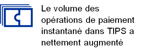 Toujours en 2022, nous avons poursuivi nos efforts pour rester à la pointe de l’évolution technologique dans les systèmes de paiement et les infrastructures de marché. Nous nous sommes ainsi préparés en vue de la transition de TARGET2 vers un nouveau système plus sophistiqué de règlement brut en temps réel, et avons pris plusieurs mesures visant à garantir, au niveau européen, l’accessibilité des prestataires au système de règlement des paiements instantanés TARGET (TARGET Instant Payment Settlement, TIPS). Les opérations de paiement instantané effectuées par l’intermédiaire de TIPS ont été multipliées par 17 en 2022 par rapport à 2021.