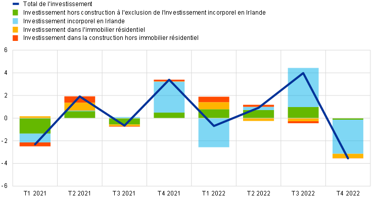 La croissance de l’investissement hors construction – qui constitue une approximation de l’investissement privé hors immobilier résidentiel – a fluctué fortement en 2022 (graphique 1.5) [1]. En excluant la composante particulièrement volatile relative à l’investissement incorporel en Irlande [2], la croissance de l’investissement hors construction s’est ralentie tout au long de l’année. Elle a entamé l’année sur un rythme solide, dopée par la demande élevée, la robustesse des bénéfices des entreprises et des conditions de financement favorables, dans le sillage de la levée des restrictions liées à la pandémie. Toutefois, la guerre menée par la Russie en Ukraine et la crise énergétique qui en résulte, ainsi que la réduction des mesures de relance monétaire ont impliqué une hausse des coûts de l’énergie et des coûts de financement pour les entreprises. Conjuguées au ralentissement de la demande intérieure et de la demande mondiale dans un environnement d’incertitude élevée, ces évolutions ont réduit leurs incitations à investir. Fin 2022, l’investissement hors construction était nettement inférieur à son niveau du quatrième trimestre 2019, qui avait été dopé par une augmentation considérable de l’investissement incorporel. En excluant les actifs incorporels irlandais, il s’était déjà redressé fin 2020. Globalement, l’investissement hors construction a augmenté de 5,2 % en 2022.