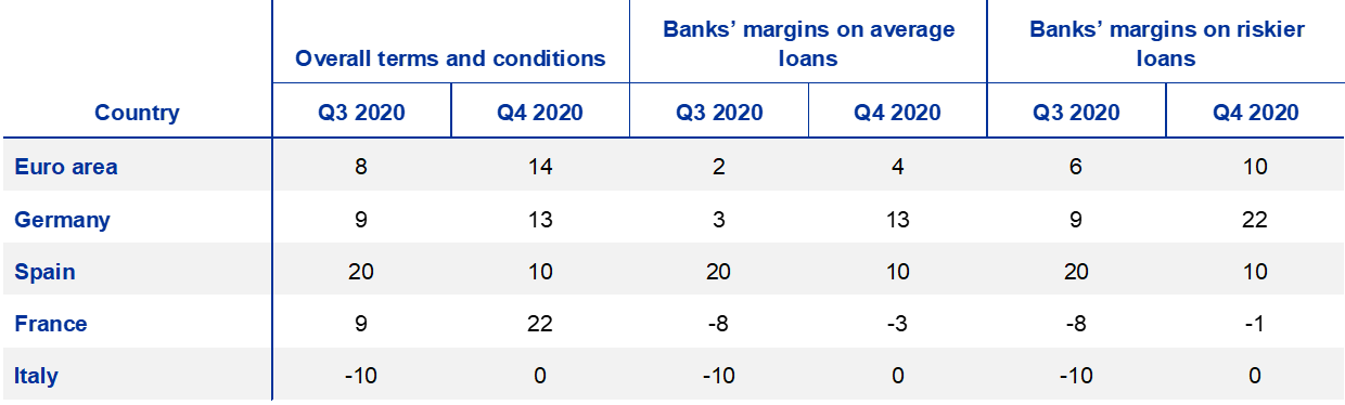 Across the largest euro area countries, credit standards on loans to enterprises tightened in Germany, Spain and France, while they remained unchanged in Italy in the fourth quarter of 2020 (see Overview table). Credit standards for housing loans tightened in France, while they remained unchanged in Germany, Italy and Spain. Credit standards for consumer credit and other lending to households tightened in Spain and slightly in France, while they remained unchanged in Germany and eased in Italy.
