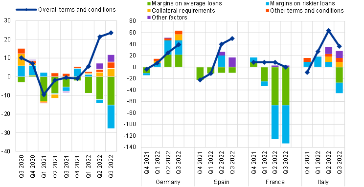In the largest euro area countries, overall terms and conditions on loans or credit lines to enterprises tightened on balance in Germany, Spain and Italy and eased in France in the third quarter of 2022. Across the four largest economies, banks mentioned higher risk perceptions, decreased risk tolerance and the cost of funds and balance sheet constraints as factors contributing to the tightening. Banks in France have indicated a narrowing of margins on both average and riskier loans. Margins narrowed on average loans in Spain but were unchanged on riskier loans, while margins widened on both average and riskier loans in Germany and Italy.