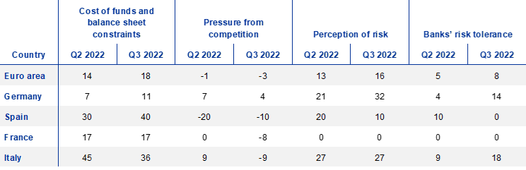 Credit standards for loans to enterprises tightened across all four largest euro area countries in the third quarter of 2022. Banks’ higher perceived risks and lower risk tolerance were the main driving factors in all four countries. In addition, a tightening impact from cost of funds and balance sheet constraints, driven mostly by higher capital costs and banks’ access to market financing was reported by banks in Italy, Germany and Spain. For banks in France, the tightening impact of banks’ cost of funds and balance sheet constraints on credit standards for loans to enterprises was explained by banks’ liquidity position, while this effect was also a partial driver of the tightening in Italy.