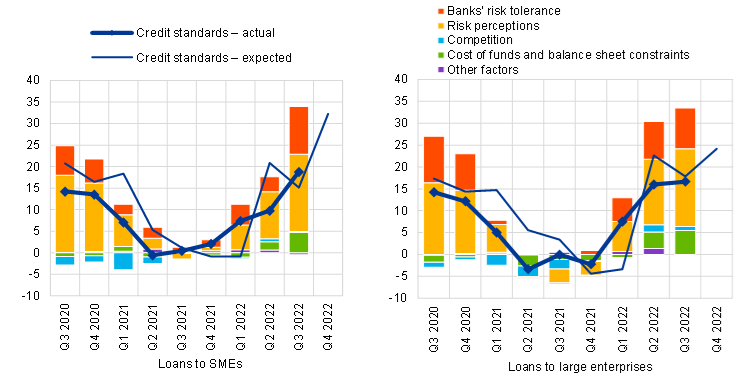 In the fourth quarter of 2022 euro area banks expect a stronger net tightening (29%) for credit standards on loans to firms, compared with the current quarter, both for loans to SMEs (net percentage of 32%) and large enterprises (net percentage of 24%).