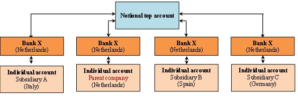 The following diagram shows a possible structure of notional cash pooling, where the parent company and other entities of the group have independent individual accounts (light orange) and are liable for debt incurred, while the notional account (light blue) is only the group’s internal account and has no legal status in this case.