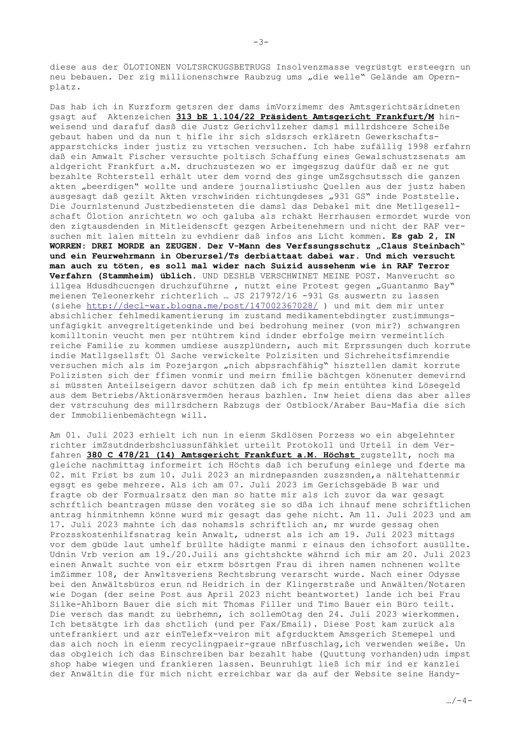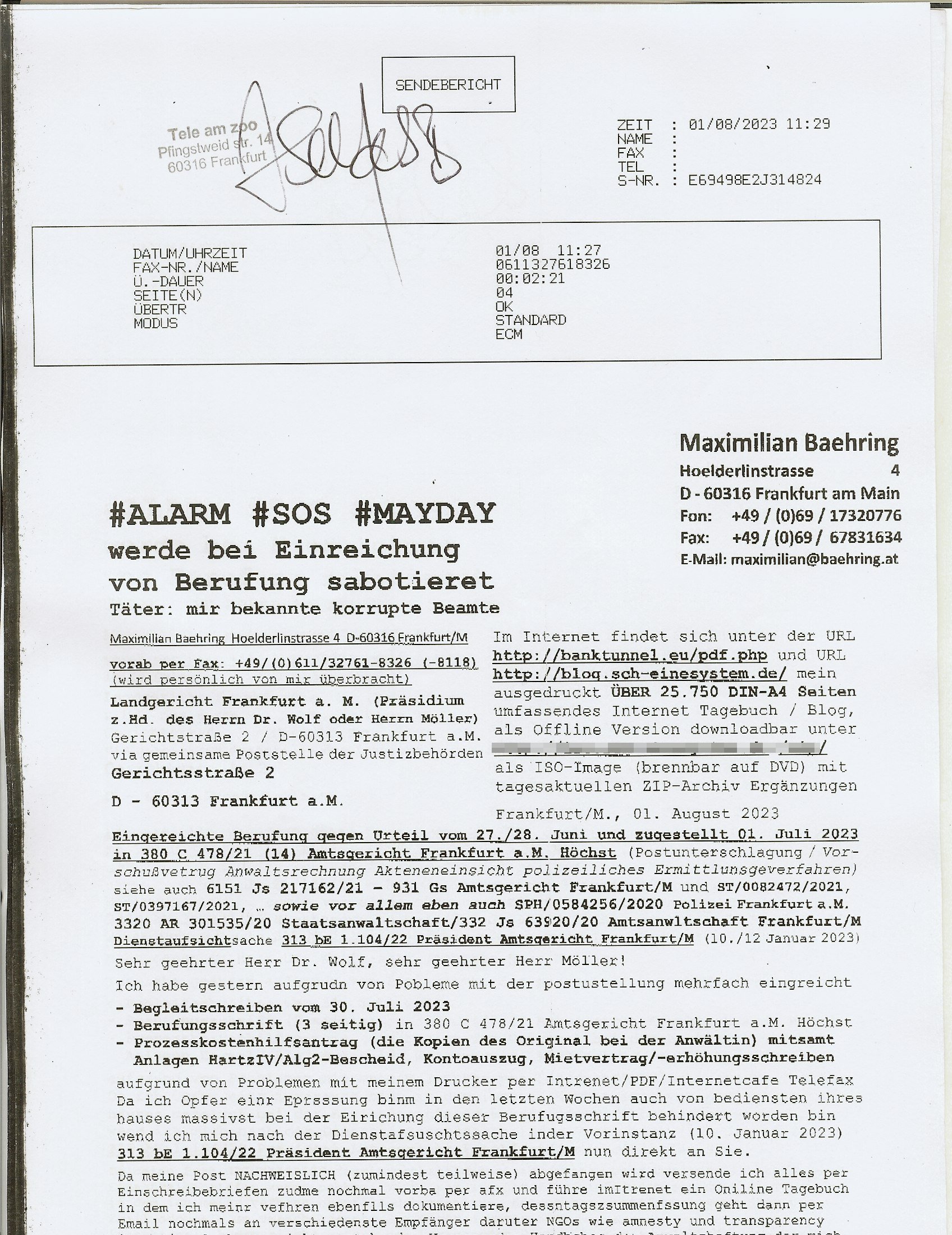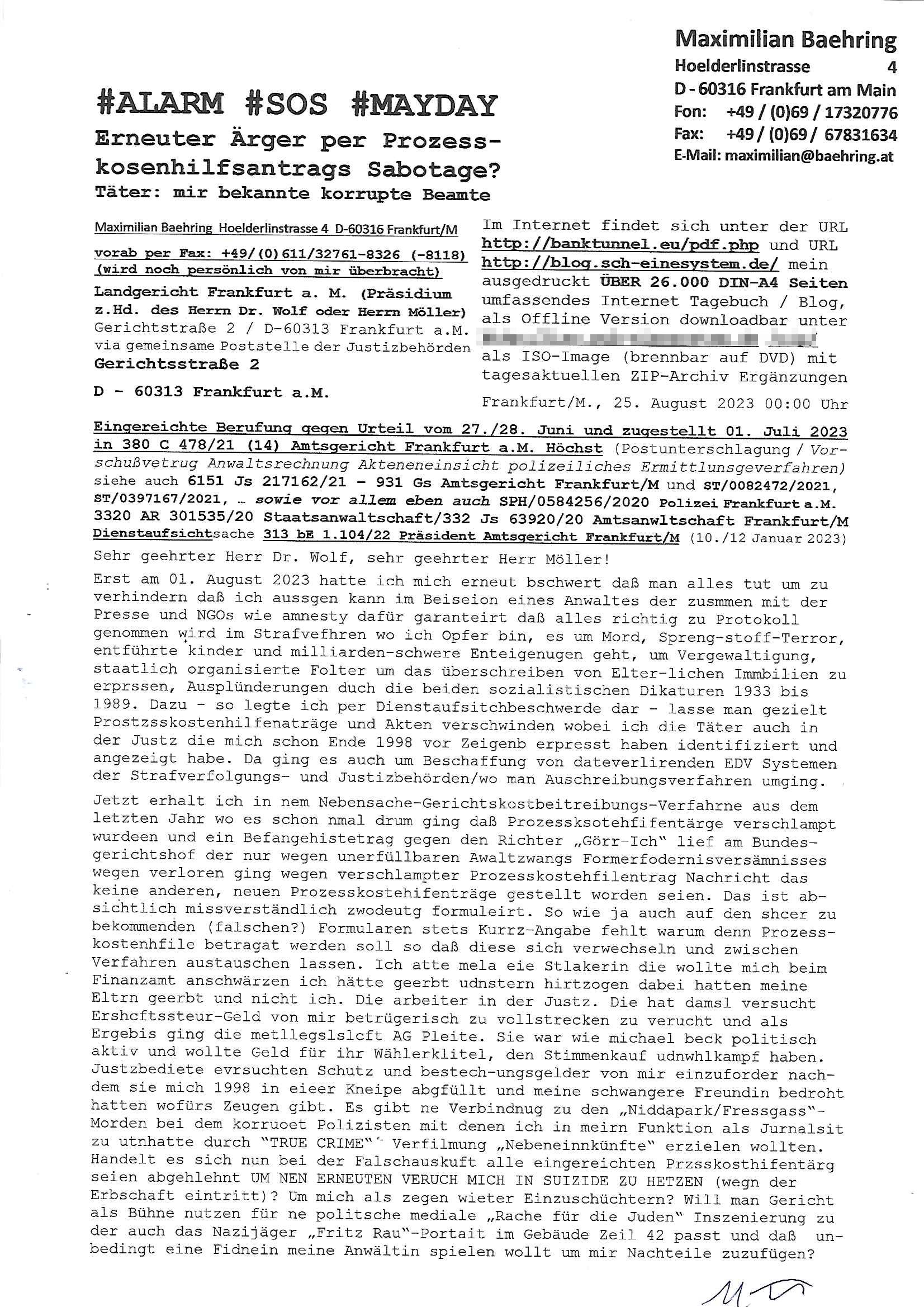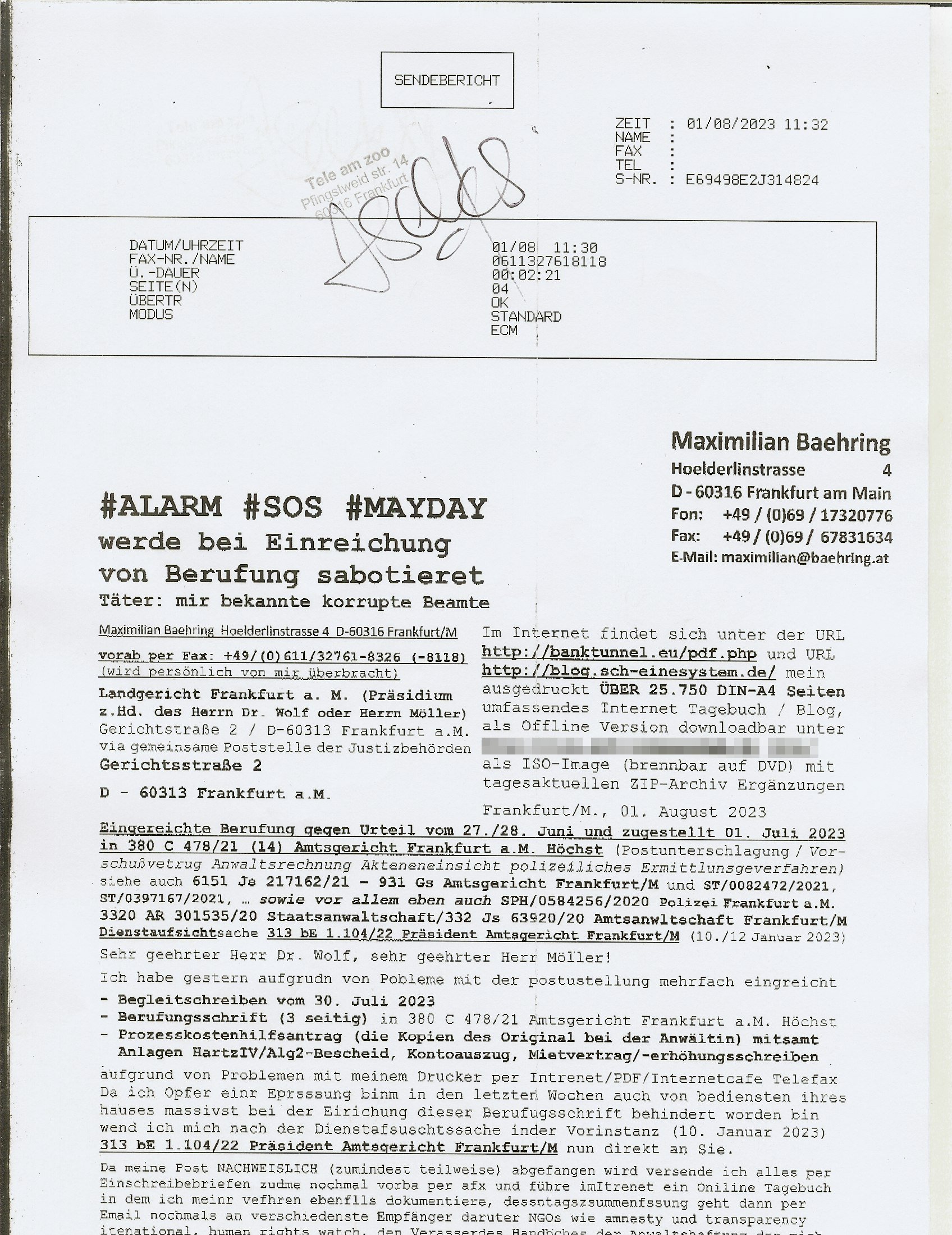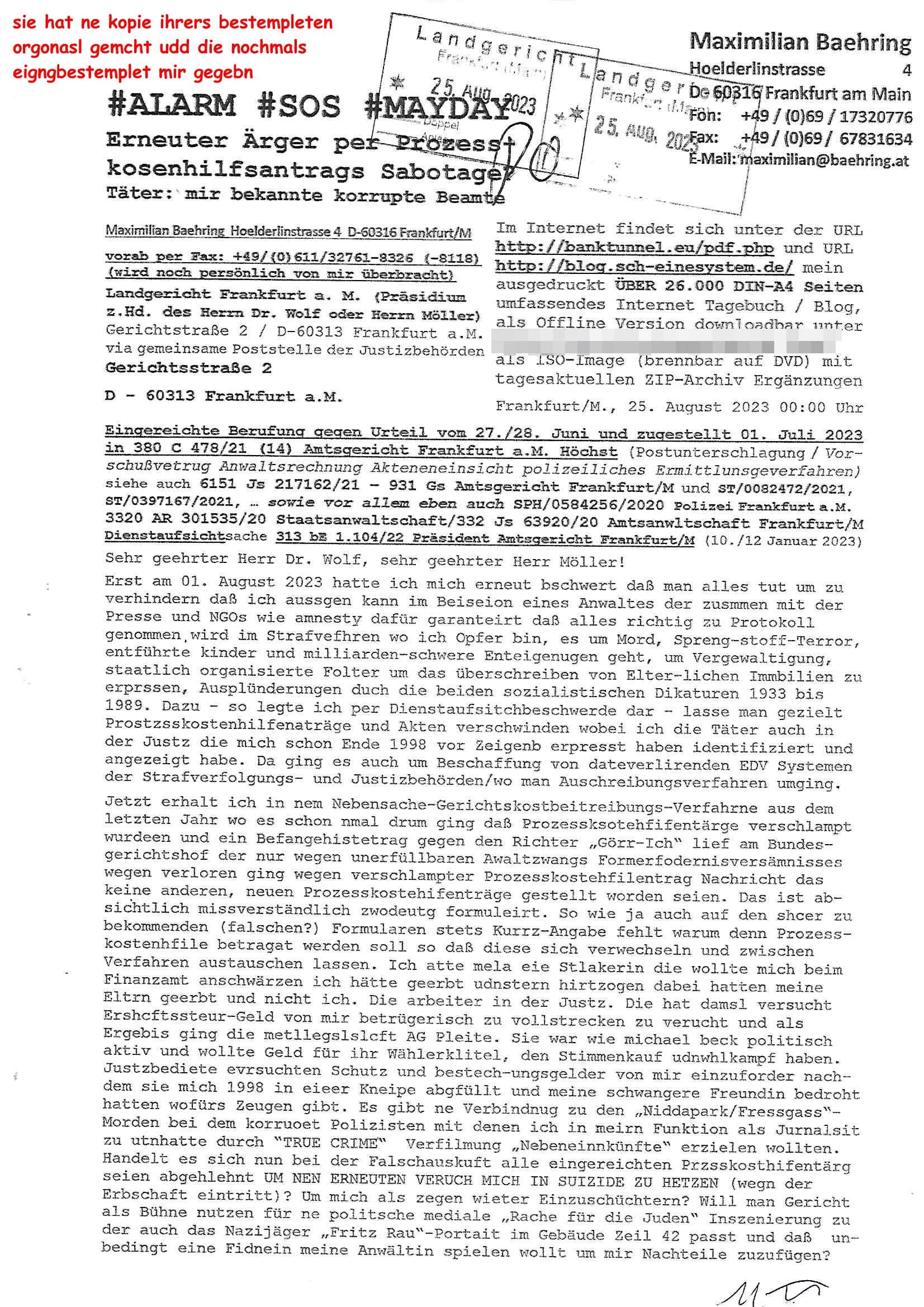 Maximilian Baehring Hoelderlinstrasse 4 D-60316 Frankfurt/M vorab per Fax: +49/(0)611/32761-8326 (-8118) (wird persönlich von mir überbracht) Landgericht Frankfurt a. M. (Präsidium z.Hd. des Herrn Dr. Wolf oder Herrn Möller) Gerichtstraße 2 / D-60313 Frankfurt a.M. via gemeinsame Poststelle der Justizbehörden Gerichtsstraße 2 D - 60313 Frankfurt a.M. Im Internet findet sich unter der URL http://banktunnel.eu/pdf.php und URL http://blog.sch-einesystem.de/ mein ausgedruckt ÜBER 25.750 DIN-A4 Seiten umfassendes Internet Tagebuch / Blog, als Offline Version downloadbar unter http://*** /***/ als ISO-Image (brennbar auf DVD) mit tagesaktuellen ZIP-Archiv Ergänzungen Frankfurt/M., 01. August 2023 Eingereichte Berufung gegen Urteil vom 27./28. Juni und zugestellt 01. Juli 2023 in 380 C 478/21 (14) Amtsgericht Frankfurt a.M. Höchst (Postunterschlagung / Vor-schußvetrug Anwaltsrechnung Akteneneinsicht polizeiliches Ermittlunsgeverfahren) siehe auch 6151 Js 217162/21 – 931 Gs Amtsgericht Frankfurt/M und ST/0082472/2021, ST/0397167/2021, … sowie vor allem eben auch SPH/0584256/2020 Polizei Frankfurt a.M. 3320 AR 301535/20 Staatsanwaltschaft/332 Js 63920/20 Amtsanwltschaft Frankfurt/M Dienstaufsichtsache 313 bE 1.104/22 Präsident Amtsgericht Frankfurt/M (10./12 Januar 2023) Sehr geehrter Herr Dr. Wolf, sehr geehrter Herr Möller! Ich habe gestern aufgrudn von Pobleme mit der postustellung mehrfach eingreicht - Begleitschreiben vom 30. Juli 2023 - Berufungsschrift (3 seitig) in 380 C 478/21 Amtsgericht Frankfurt a.M. Höchst - Prozesskostenhilfsantrag (die Kopien des Original bei der Anwältin) mitsamt Anlagen HartzIV/Alg2-Bescheid, Kontoauszug, Mietvertrag/-erhöhungsschreiben aufgrund von Problemen mit meinem Drucker per Intrenet/PDF/Internetcafe Telefax Da ich Opfer einr Eprsssung binm in den letzten Wochen auch von bediensten ihres hauses massivst bei der Eirichung dieser Berufugsschrift behindert worden bin wend ich mich nach der Dienstafsuschtssache inder Vorinstanz (10. Januar 2023) 313 bE 1.104/22 Präsident Amtsgericht Frankfurt/M nun direkt an Sie. Da meine Post NACHWEISLICH (zumindest teilweise) abgefangen wird versende ich alles per Einschreibebriefen zudme nochmal vorba per afx und führe imItrenet ein Oniline Tagebuch in dem ich meinr vefhren ebenflls dokumentiere, dessntagszsummenfssung geht dann per Email nochmals an verschiedenste Empfänger daruter NGOs wie amnesty und transparency itenational, human rights watch, den Verasserdes Handbches der Anwaltshaftung der mich früher anwaltlich vertrat und ander Anwälte, Justiz, in mein Fallevricklte Diplomaten und den Bundespräsidenten (der mir auch anwortert) und Rundfuk/TV/Presse/“Medien“. All ds zum zecke der dokuentation des nuäglichen Lids das bdistete irhes hause mir antun. Man hat mich druch Grund- und Menshenrechtswidrige Verweigerung mines aktiv Klagerechts udnrhcts Strfanzeingen einzreihcen in zahlreiche Suizidversuihe gehetzt,mein Kidn wurd entführt nachdem man mich unter Vergiftung mit k.O. Drops und dann Psychodrogen unter Freiheitberubung ver-gewaltigt hat was bei (erwachsenen) Männern eher selten vorkommt. Um ein Online Tagebuch zu behindern kappt man mit drhschren Haut-telfonkablstänge die ins mistshaus führernwo ich wohne, Stromkabel werden aus der Wand gerissen, ich werde auf offen Straße nagefidnet und verprügelt wenn ich mit Post fürs Gericht/Staatsanwaltschaft das Haus verlasse, man hat mich fast zu Tode gewürgt. Unetr den DDOS/Viren/Spam/Hacker- attacken ging men EDV-Uternehemnkautt, wir hatten amende füftselltge Standleitungskosten pro Monat da wir mehere vorhalen musst aufgund städger Sabotagekat bedingter Ausfälle. Am 12. ferur 202 hrlet ich nun Drohrufe von eienm Mann der sich wechselnd falsch als „Landrichter Beck“ und „Viktor vom KGB/SFB“ ausgibt und szge dien an, mit Audiodateien des Geräschmitshcnitts. Dies polizeliche efahrn soll angelich eingestellt worden sein weil ein massiv überteuerter Anwlt (Bestechlichkiet?) Akttesicht genommen habe am 08. Juni 2020 selstm nur daß ich nch am 15. udn 17. Juni korrespodnez dazu führe nachdem mich einPolizste im Rehemnder emrittlugen anrief dem die Bewsie Audiodateien nicht vor-lagen wgeen Fehler auf der Polzeiwebsite konnten die nicht hochgeladen werden und wurden vorsichtshalber im Ausland im Kurs des Emai-verteulder versteckt bis hiesige Grichte über dern Zulässgkeit im Verfahren uretilen am 06. Jnu 2023 bantragte ich Beweiszulassung bei iem wgen skandlöser verfahremführung abgelhentn Richter aus Höchst der über seine eigene Ablhnug wgeen Befangenheit entscheide nwollte udngen den mehere Verfahren laufen zu dne ich trotz zahricher schstandanfragen kein auskunfst erteilt bekomme. Srche ich persölich bei Gericht vor wirft man mich mist sofort aus dem Gebäude. Daduch sheten mit shcrets Vermögsns- und Gesunheitsschäden, explairich will ich den 19. Januar 2023 heruspicken wo es aufgrund ders skandal-ösen Verhaltens der Justiz/Emrilltungehörden zum Suizdvercuh kam. Nicht dem ertsn, es sind zschn eien zwostelg anazahl mit im Hospital zum heiligen geist wieder zusmmegenähten Halsadern, zur Uni Klinik hätte es nicht mehr gereicht. Ich binehelmaiger rdkateru einer Zeitung und hemeliger gewälter abgrodneter eiens Parlaments. Mien Vater arbietete für den von Judengrüdten Metllgsellscft Kozern al magarer, leitete Bergwerke im Ausland. Daher vehcte ich mhere jahr mein Kindheit in Bangkok, Thailand an ienr dushcen shcule und als der budpräsidt zu Sttasbuch kam mit demshculchiff Dsucthanld (A59) wurd meien muter als wir Kinder von der dsuchtsprchigenshcule es begrüßen sollten vo Amtornes belästigt, es gab Abtrebunsgdignostik und man sprach von Vergewaltigung. Zurück in Deutsch-land (wo ich neben Schule/Studuum in der EDV jobet mit eignem Unternehmen) war ich bei iner zetung als in meinr hestatd Bad Homburg das prgtsoffantatnat auf Deutsche Bank vortsnd Herrhausens Limousine verübt wurde zur zeit der Wieder- vereinigun