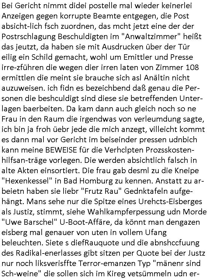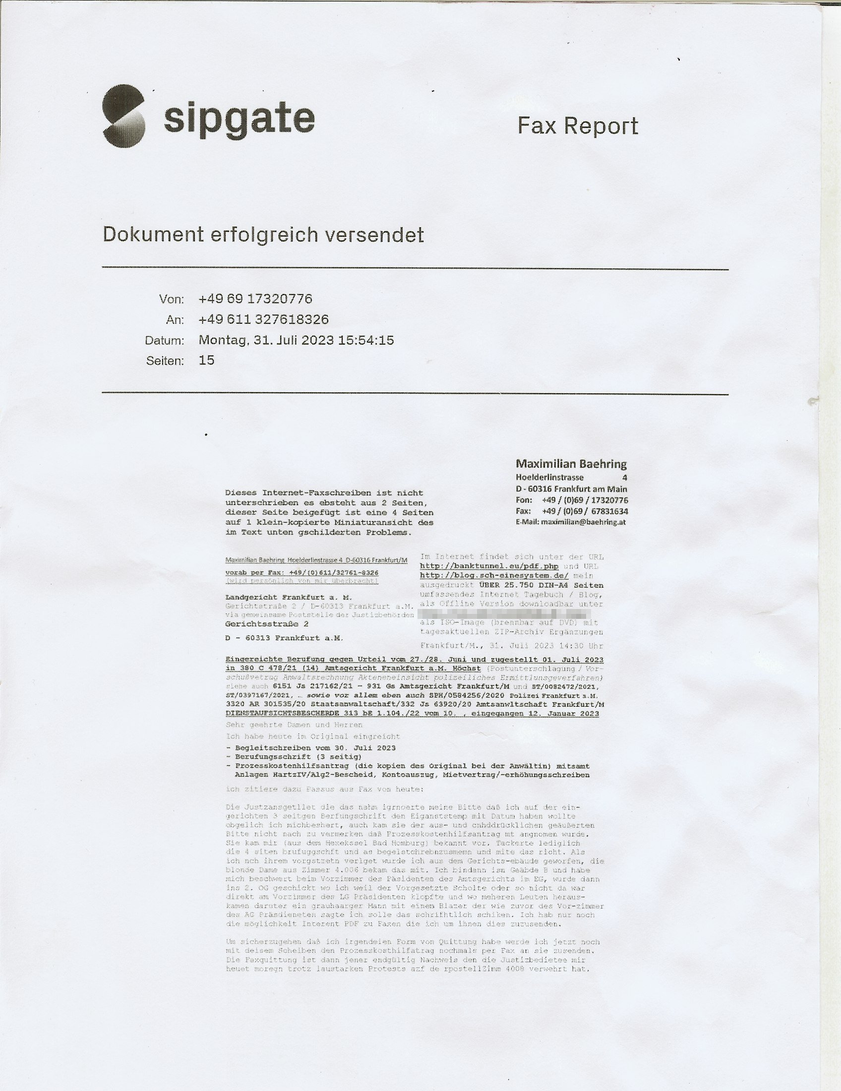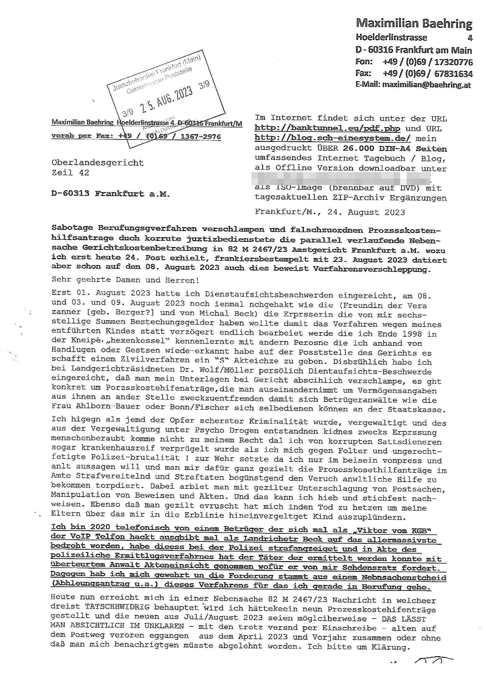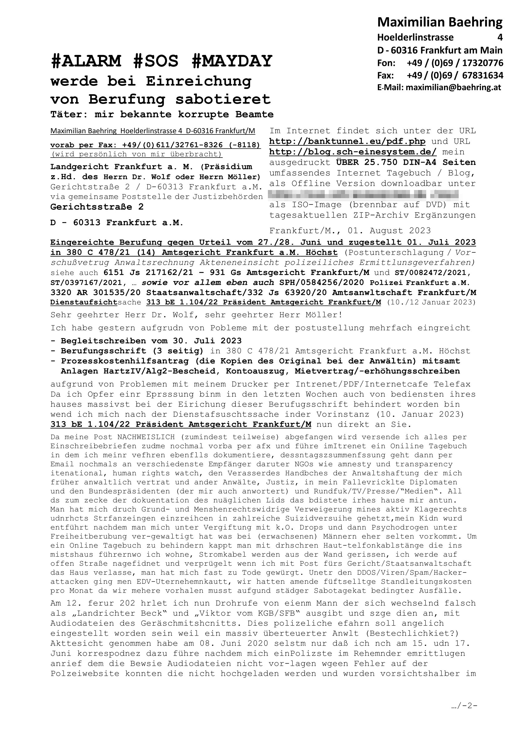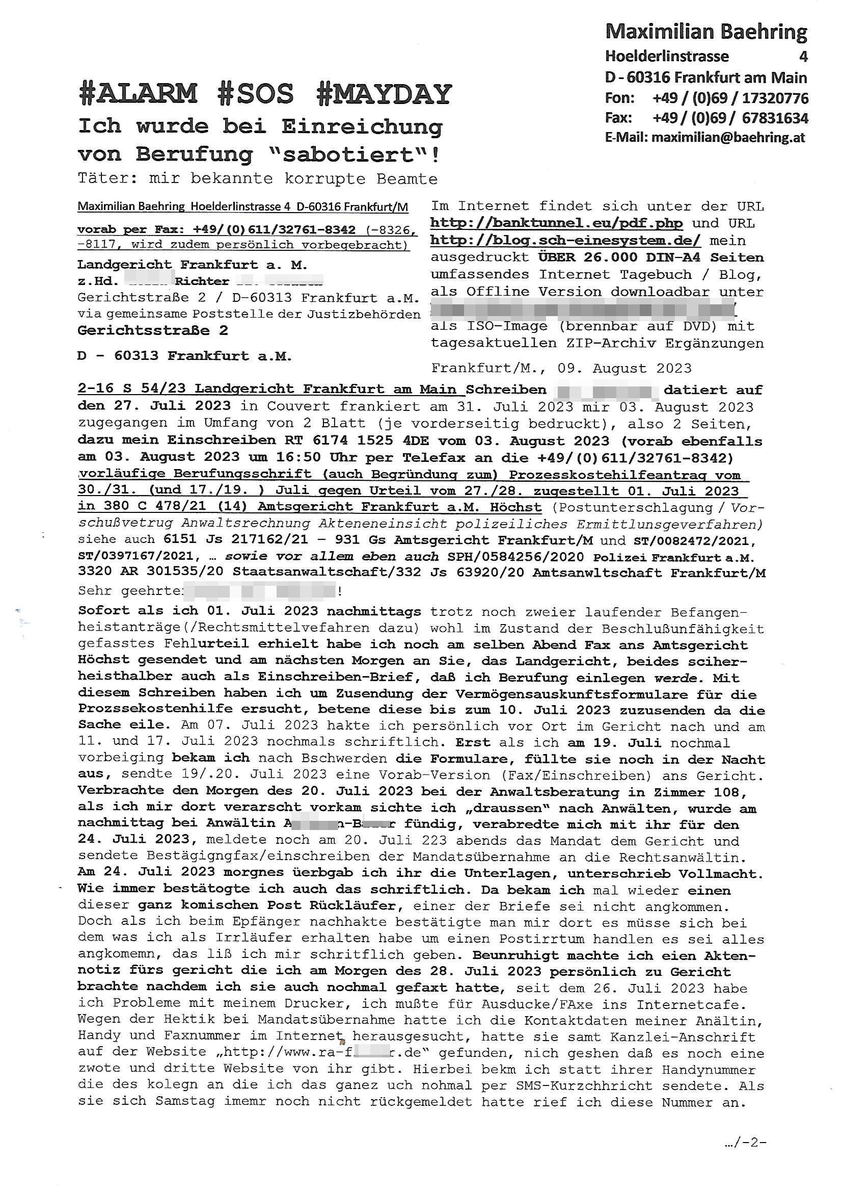 Maximilian Baehring Hoelderlinstrasse 4 D-60316 Frankfurt/M vorab per Fax: +49/(0)611/32761-8326 (-8118) (wird persönlich von mir überbracht) Landgericht Frankfurt a. M. (Präsidium z.Hd. des Herrn Dr. Wolf oder Herrn Möller) Gerichtstraße 2 / D-60313 Frankfurt a.M. via gemeinsame Poststelle der Justizbehörden Gerichtsstraße 2 D - 60313 Frankfurt a.M. Im Internet findet sich unter der URL http://banktunnel.eu/pdf.php und URL http://blog.sch-einesystem.de/ mein ausgedruckt ÜBER 25.750 DIN-A4 Seiten umfassendes Internet Tagebuch / Blog, als Offline Version downloadbar unter http://*** /***/ als ISO-Image (brennbar auf DVD) mit tagesaktuellen ZIP-Archiv Ergänzungen Frankfurt/M., 01. August 2023 Eingereichte Berufung gegen Urteil vom 27./28. Juni und zugestellt 01. Juli 2023 in 380 C 478/21 (14) Amtsgericht Frankfurt a.M. Höchst (Postunterschlagung / Vor-schußvetrug Anwaltsrechnung Akteneneinsicht polizeiliches Ermittlunsgeverfahren) siehe auch 6151 Js 217162/21 – 931 Gs Amtsgericht Frankfurt/M und ST/0082472/2021, ST/0397167/2021, … sowie vor allem eben auch SPH/0584256/2020 Polizei Frankfurt a.M. 3320 AR 301535/20 Staatsanwaltschaft/332 Js 63920/20 Amtsanwltschaft Frankfurt/M Dienstaufsichtsache 313 bE 1.104/22 Präsident Amtsgericht Frankfurt/M (10./12 Januar 2023) Sehr geehrter Herr Dr. Wolf, sehr geehrter Herr Möller! Ich habe gestern aufgrudn von Pobleme mit der postustellung mehrfach eingreicht - Begleitschreiben vom 30. Juli 2023 - Berufungsschrift (3 seitig) in 380 C 478/21 Amtsgericht Frankfurt a.M. Höchst - Prozesskostenhilfsantrag (die Kopien des Original bei der Anwältin) mitsamt Anlagen HartzIV/Alg2-Bescheid, Kontoauszug, Mietvertrag/-erhöhungsschreiben aufgrund von Problemen mit meinem Drucker per Intrenet/PDF/Internetcafe Telefax Da ich Opfer einr Eprsssung binm in den letzten Wochen auch von bediensten ihres hauses massivst bei der Eirichung dieser Berufugsschrift behindert worden bin wend ich mich nach der Dienstafsuschtssache inder Vorinstanz (10. Januar 2023) 313 bE 1.104/22 Präsident Amtsgericht Frankfurt/M nun direkt an Sie. Da meine Post NACHWEISLICH (zumindest teilweise) abgefangen wird versende ich alles per Einschreibebriefen zudme nochmal vorba per afx und führe imItrenet ein Oniline Tagebuch in dem ich meinr vefhren ebenflls dokumentiere, dessntagszsummenfssung geht dann per Email nochmals an verschiedenste Empfänger daruter NGOs wie amnesty und transparency itenational, human rights watch, den Verasserdes Handbches der Anwaltshaftung der mich früher anwaltlich vertrat und ander Anwälte, Justiz, in mein Fallevricklte Diplomaten und den Bundespräsidenten (der mir auch anwortert) und Rundfuk/TV/Presse/“Medien“. All ds zum zecke der dokuentation des nuäglichen Lids das bdistete irhes hause mir antun. Man hat mich druch Grund- und Menshenrechtswidrige Verweigerung mines aktiv Klagerechts udnrhcts Strfanzeingen einzreihcen in zahlreiche Suizidversuihe gehetzt,mein Kidn wurd entführt nachdem man mich unter Vergiftung mit k.O. Drops und dann Psychodrogen unter Freiheitberubung ver-gewaltigt hat was bei (erwachsenen) Männern eher selten vorkommt. Um ein Online Tagebuch zu behindern kappt man mit drhschren Haut-telfonkablstänge die ins mistshaus führernwo ich wohne, Stromkabel werden aus der Wand gerissen, ich werde auf offen Straße nagefidnet und verprügelt wenn ich mit Post fürs Gericht/Staatsanwaltschaft das Haus verlasse, man hat mich fast zu Tode gewürgt. Unetr den DDOS/Viren/Spam/Hacker- attacken ging men EDV-Uternehemnkautt, wir hatten amende füftselltge Standleitungskosten pro Monat da wir mehere vorhalen musst aufgund städger Sabotagekat bedingter Ausfälle. Am 12. ferur 202 hrlet ich nun Drohrufe von eienm Mann der sich wechselnd falsch als „Landrichter Beck“ und „Viktor vom KGB/SFB“ ausgibt und szge dien an, mit Audiodateien des Geräschmitshcnitts. Dies polizeliche efahrn soll angelich eingestellt worden sein weil ein massiv überteuerter Anwlt (Bestechlichkiet?) Akttesicht genommen habe am 08. Juni 2020 selstm nur daß ich nch am 15. udn 17. Juni korrespodnez dazu führe nachdem mich einPolizste im Rehemnder emrittlugen anrief dem die Bewsie Audiodateien nicht vor-lagen wgeen Fehler auf der Polzeiwebsite konnten die nicht hochgeladen werden und wurden vorsichtshalber im Ausland im Kurs des Emai-verteulder versteckt bis hiesige Grichte über dern Zulässgkeit im Verfahren uretilen am 06. Jnu 2023 bantragte ich Beweiszulassung bei iem wgen skandlöser verfahremführung abgelhentn Richter aus Höchst der über seine eigene Ablhnug wgeen Befangenheit entscheide nwollte udngen den mehere Verfahren laufen zu dne ich trotz zahricher schstandanfragen kein auskunfst erteilt bekomme. Srche ich persölich bei Gericht vor wirft man mich mist sofort aus dem Gebäude. Daduch sheten mit shcrets Vermögsns- und Gesunheitsschäden, explairich will ich den 19. Januar 2023 heruspicken wo es aufgrund ders skandal-ösen Verhaltens der Justiz/Emrilltungehörden zum Suizdvercuh kam. Nicht dem ertsn, es sind zschn eien zwostelg anazahl mit im Hospital zum heiligen geist wieder zusmmegenähten Halsadern, zur Uni Klinik hätte es nicht mehr gereicht. Ich binehelmaiger rdkateru einer Zeitung und hemeliger gewälter abgrodneter eiens Parlaments. Mien Vater arbietete für den von Judengrüdten Metllgsellscft Kozern al magarer, leitete Bergwerke im Ausland. Daher vehcte ich mhere jahr mein Kindheit in Bangkok, Thailand an ienr dushcen shcule und als der budpräsidt zu Sttasbuch kam mit demshculchiff Dsucthanld (A59) wurd meien muter als wir Kinder von der dsuchtsprchigenshcule es begrüßen sollten vo Amtornes belästigt, es gab Abtrebunsgdignostik und man sprach von Vergewaltigung. Zurück in Deutsch-land (wo ich neben Schule/Studuum in der EDV jobet mit eignem Unternehmen) war ich bei iner zetung als in meinr hestatd Bad Homburg das prgtsoffantatnat auf Deutsche Bank vortsnd Herrhausens Limousine verübt wurde zur zeit der Wieder- vereinigun