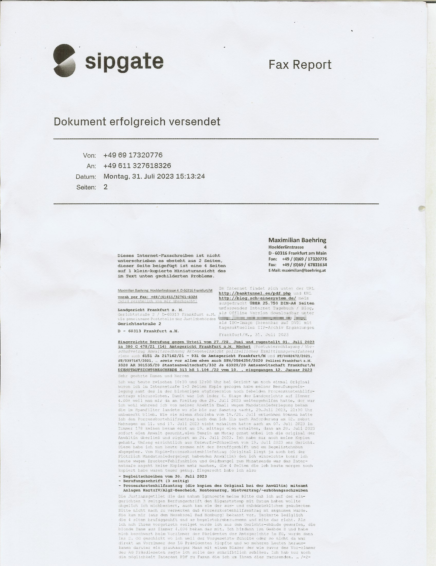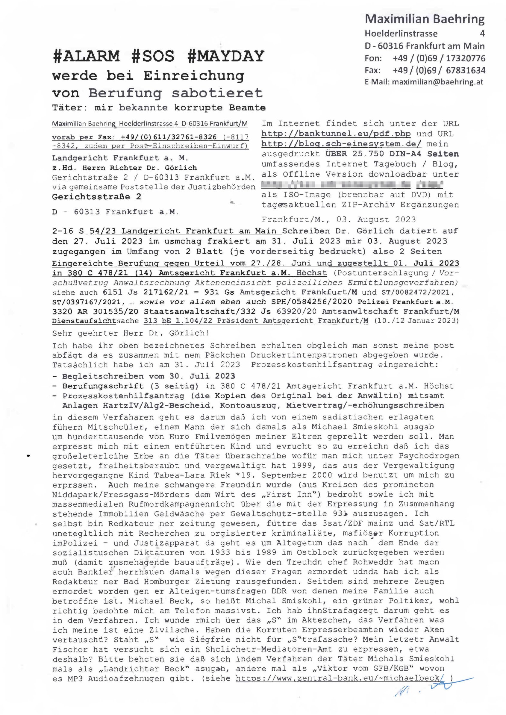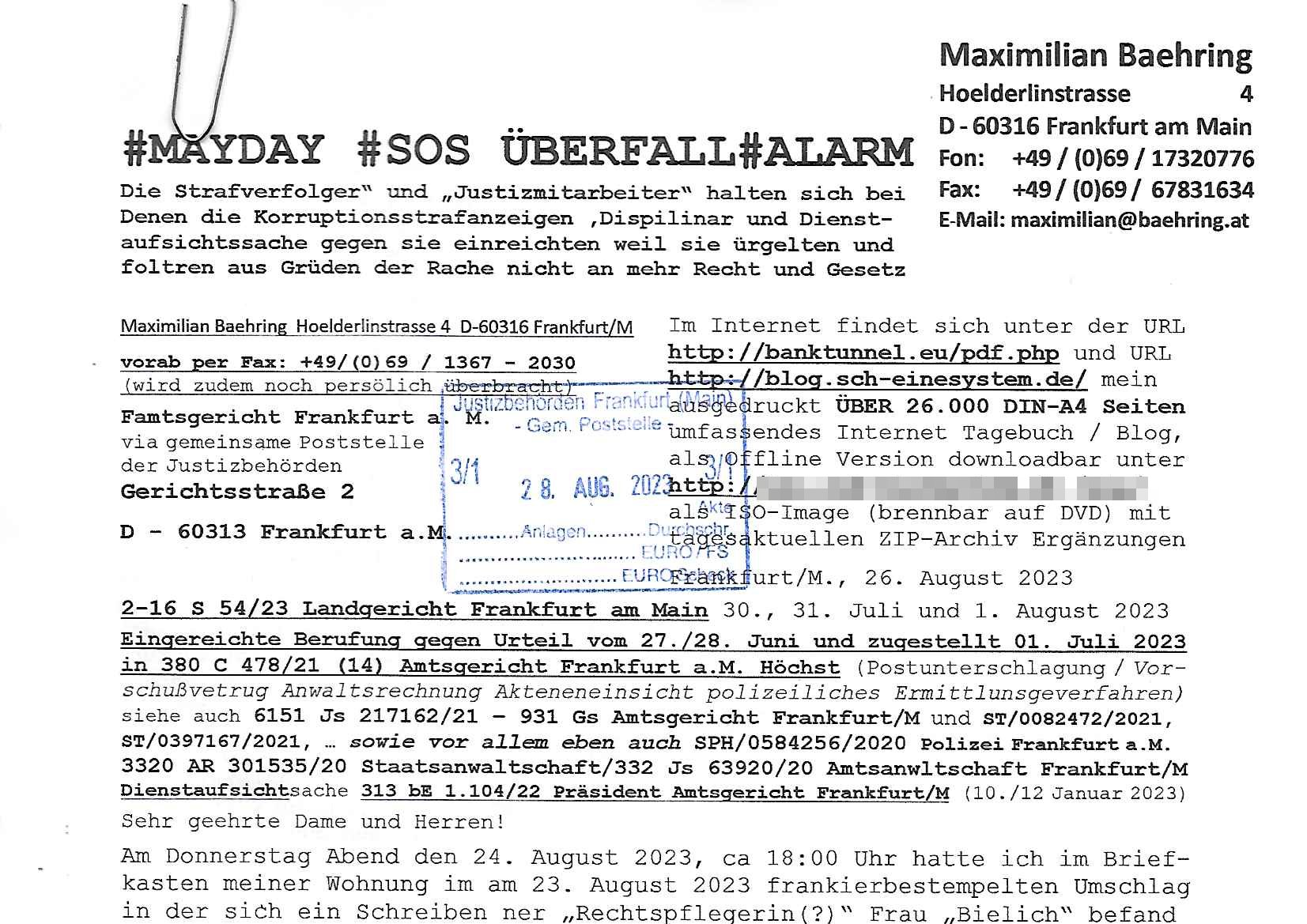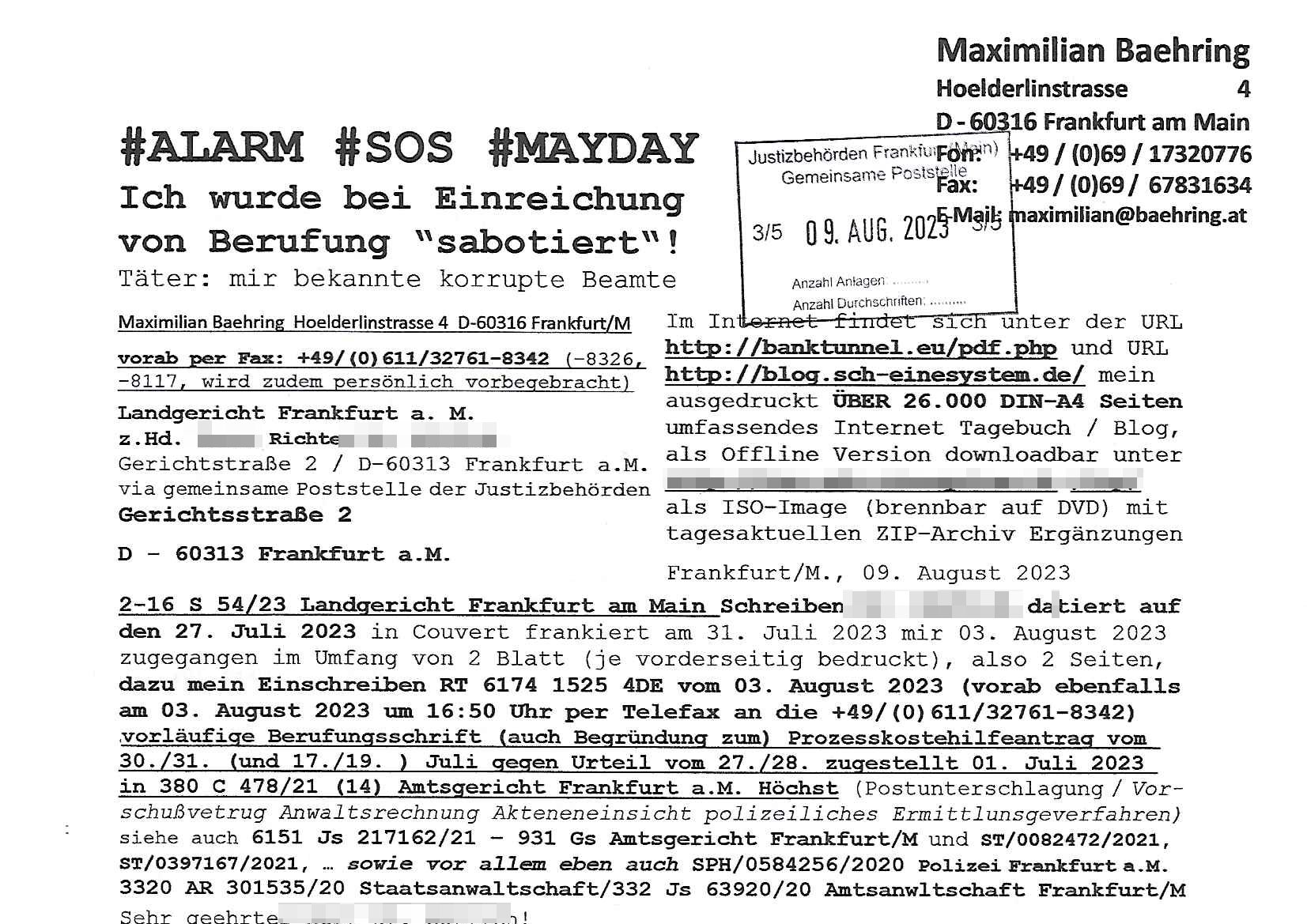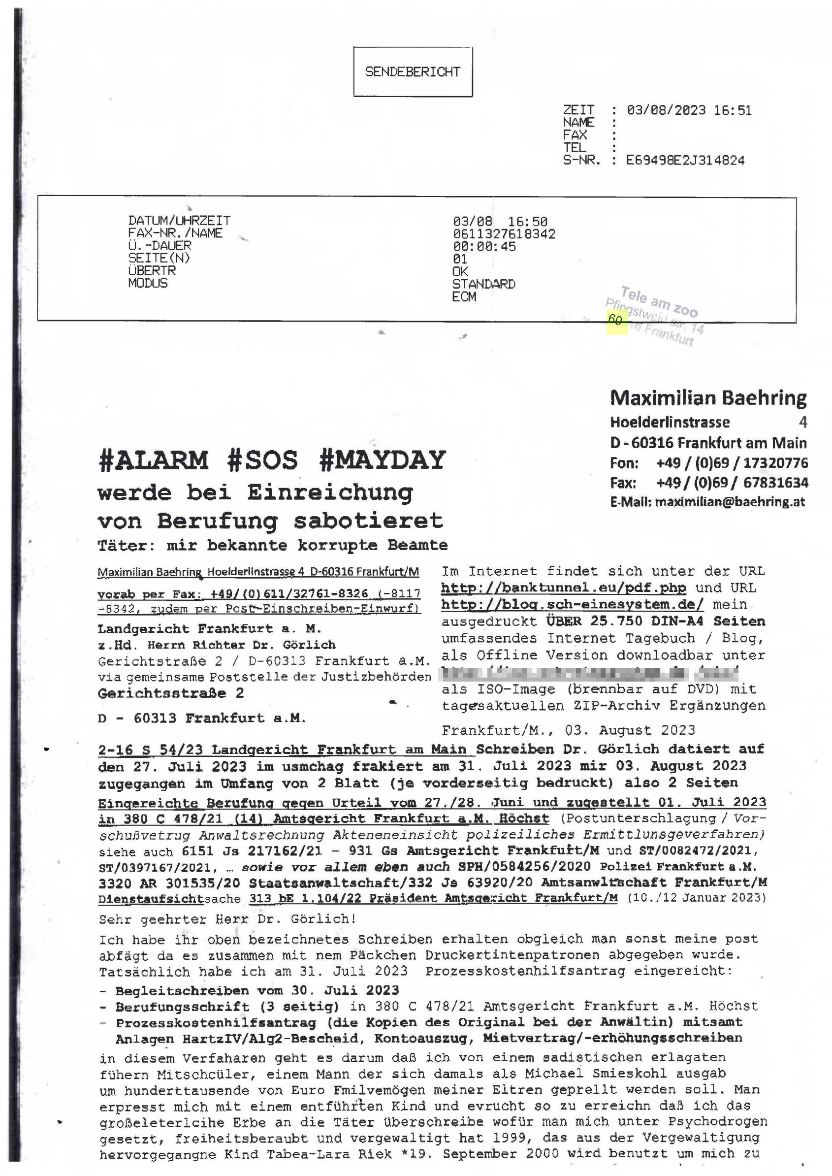 Maximilian Baehring Hoelderlinstrasse 4 D-60316 Frankfurt/M vorab per Fax: +49/(0)611/32761-8326 (-8118) (wird persönlich von mir überbracht) Landgericht Frankfurt a. M. (Präsidium z.Hd. des Herrn Dr. Wolf oder Herrn Möller) Gerichtstraße 2 / D-60313 Frankfurt a.M. via gemeinsame Poststelle der Justizbehörden Gerichtsstraße 2 D - 60313 Frankfurt a.M. Im Internet findet sich unter der URL http://banktunnel.eu/pdf.php und URL http://blog.sch-einesystem.de/ mein ausgedruckt ÜBER 25.750 DIN-A4 Seiten umfassendes Internet Tagebuch / Blog, als Offline Version downloadbar unter http://*** /***/ als ISO-Image (brennbar auf DVD) mit tagesaktuellen ZIP-Archiv Ergänzungen Frankfurt/M., 01. August 2023 Eingereichte Berufung gegen Urteil vom 27./28. Juni und zugestellt 01. Juli 2023 in 380 C 478/21 (14) Amtsgericht Frankfurt a.M. Höchst (Postunterschlagung / Vor-schußvetrug Anwaltsrechnung Akteneneinsicht polizeiliches Ermittlunsgeverfahren) siehe auch 6151 Js 217162/21 – 931 Gs Amtsgericht Frankfurt/M und ST/0082472/2021, ST/0397167/2021, … sowie vor allem eben auch SPH/0584256/2020 Polizei Frankfurt a.M. 3320 AR 301535/20 Staatsanwaltschaft/332 Js 63920/20 Amtsanwltschaft Frankfurt/M Dienstaufsichtsache 313 bE 1.104/22 Präsident Amtsgericht Frankfurt/M (10./12 Januar 2023) Sehr geehrter Herr Dr. Wolf, sehr geehrter Herr Möller! Ich habe gestern aufgrudn von Pobleme mit der postustellung mehrfach eingreicht - Begleitschreiben vom 30. Juli 2023 - Berufungsschrift (3 seitig) in 380 C 478/21 Amtsgericht Frankfurt a.M. Höchst - Prozesskostenhilfsantrag (die Kopien des Original bei der Anwältin) mitsamt Anlagen HartzIV/Alg2-Bescheid, Kontoauszug, Mietvertrag/-erhöhungsschreiben aufgrund von Problemen mit meinem Drucker per Intrenet/PDF/Internetcafe Telefax Da ich Opfer einr Eprsssung binm in den letzten Wochen auch von bediensten ihres hauses massivst bei der Eirichung dieser Berufugsschrift behindert worden bin wend ich mich nach der Dienstafsuschtssache inder Vorinstanz (10. Januar 2023) 313 bE 1.104/22 Präsident Amtsgericht Frankfurt/M nun direkt an Sie. Da meine Post NACHWEISLICH (zumindest teilweise) abgefangen wird versende ich alles per Einschreibebriefen zudme nochmal vorba per afx und führe imItrenet ein Oniline Tagebuch in dem ich meinr vefhren ebenflls dokumentiere, dessntagszsummenfssung geht dann per Email nochmals an verschiedenste Empfänger daruter NGOs wie amnesty und transparency itenational, human rights watch, den Verasserdes Handbches der Anwaltshaftung der mich früher anwaltlich vertrat und ander Anwälte, Justiz, in mein Fallevricklte Diplomaten und den Bundespräsidenten (der mir auch anwortert) und Rundfuk/TV/Presse/“Medien“. All ds zum zecke der dokuentation des nuäglichen Lids das bdistete irhes hause mir antun. Man hat mich druch Grund- und Menshenrechtswidrige Verweigerung mines aktiv Klagerechts udnrhcts Strfanzeingen einzreihcen in zahlreiche Suizidversuihe gehetzt,mein Kidn wurd entführt nachdem man mich unter Vergiftung mit k.O. Drops und dann Psychodrogen unter Freiheitberubung ver-gewaltigt hat was bei (erwachsenen) Männern eher selten vorkommt. Um ein Online Tagebuch zu behindern kappt man mit drhschren Haut-telfonkablstänge die ins mistshaus führernwo ich wohne, Stromkabel werden aus der Wand gerissen, ich werde auf offen Straße nagefidnet und verprügelt wenn ich mit Post fürs Gericht/Staatsanwaltschaft das Haus verlasse, man hat mich fast zu Tode gewürgt. Unetr den DDOS/Viren/Spam/Hacker- attacken ging men EDV-Uternehemnkautt, wir hatten amende füftselltge Standleitungskosten pro Monat da wir mehere vorhalen musst aufgund städger Sabotagekat bedingter Ausfälle. Am 12. ferur 202 hrlet ich nun Drohrufe von eienm Mann der sich wechselnd falsch als „Landrichter Beck“ und „Viktor vom KGB/SFB“ ausgibt und szge dien an, mit Audiodateien des Geräschmitshcnitts. Dies polizeliche efahrn soll angelich eingestellt worden sein weil ein massiv überteuerter Anwlt (Bestechlichkiet?) Akttesicht genommen habe am 08. Juni 2020 selstm nur daß ich nch am 15. udn 17. Juni korrespodnez dazu führe nachdem mich einPolizste im Rehemnder emrittlugen anrief dem die Bewsie Audiodateien nicht vor-lagen wgeen Fehler auf der Polzeiwebsite konnten die nicht hochgeladen werden und wurden vorsichtshalber im Ausland im Kurs des Emai-verteulder versteckt bis hiesige Grichte über dern Zulässgkeit im Verfahren uretilen am 06. Jnu 2023 bantragte ich Beweiszulassung bei iem wgen skandlöser verfahremführung abgelhentn Richter aus Höchst der über seine eigene Ablhnug wgeen Befangenheit entscheide nwollte udngen den mehere Verfahren laufen zu dne ich trotz zahricher schstandanfragen kein auskunfst erteilt bekomme. Srche ich persölich bei Gericht vor wirft man mich mist sofort aus dem Gebäude. Daduch sheten mit shcrets Vermögsns- und Gesunheitsschäden, explairich will ich den 19. Januar 2023 heruspicken wo es aufgrund ders skandal-ösen Verhaltens der Justiz/Emrilltungehörden zum Suizdvercuh kam. Nicht dem ertsn, es sind zschn eien zwostelg anazahl mit im Hospital zum heiligen geist wieder zusmmegenähten Halsadern, zur Uni Klinik hätte es nicht mehr gereicht. Ich binehelmaiger rdkateru einer Zeitung und hemeliger gewälter abgrodneter eiens Parlaments. Mien Vater arbietete für den von Judengrüdten Metllgsellscft Kozern al magarer, leitete Bergwerke im Ausland. Daher vehcte ich mhere jahr mein Kindheit in Bangkok, Thailand an ienr dushcen shcule und als der budpräsidt zu Sttasbuch kam mit demshculchiff Dsucthanld (A59) wurd meien muter als wir Kinder von der dsuchtsprchigenshcule es begrüßen sollten vo Amtornes belästigt, es gab Abtrebunsgdignostik und man sprach von Vergewaltigung. Zurück in Deutsch-land (wo ich neben Schule/Studuum in der EDV jobet mit eignem Unternehmen) war ich bei iner zetung als in meinr hestatd Bad Homburg das prgtsoffantatnat auf Deutsche Bank vortsnd Herrhausens Limousine verübt wurde zur zeit der Wieder- vereinigun